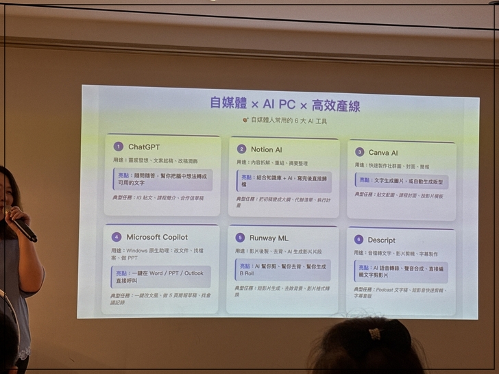 老師推薦的6大AI包括文案發想、內容整理、圖片生成、影片後製、語音轉錄,再利用Copilot整合,確實分工完成工作。