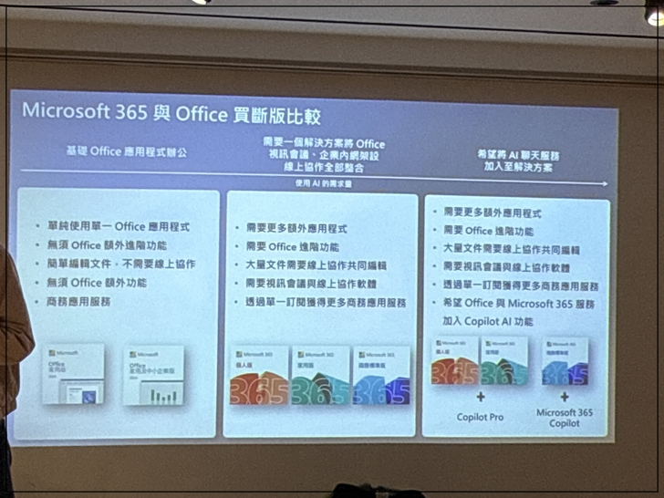 很多人會疑問,微軟365跟Office買斷版有何差異?簡單來說只是一般辦公,使用買斷版即可,如果需要AI支持,就要用365。