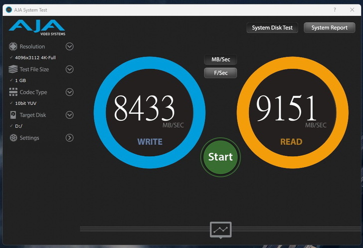 用4096x3112 10bit的Video Frame Size測試,測得 讀取 9151MB/s、寫入 8433MB/s。
