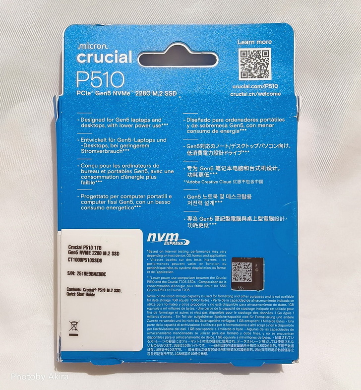 ▼ 背面有標示品項、型號:CT1000P510SSD8、序號等資訊以及協議、認證和容量跟QR碼的部份。