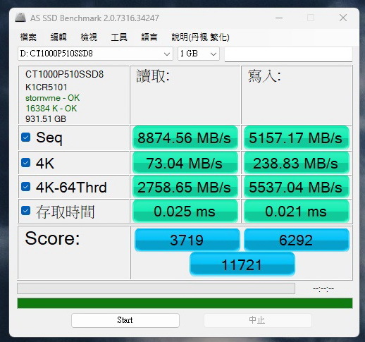 循序讀取 8874.56MB/s、寫入 5157.17MB/s,總分獲得 11721。