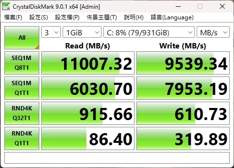Crystal Disk Mark循序讀取11007MB/s、寫入9539MB/s。