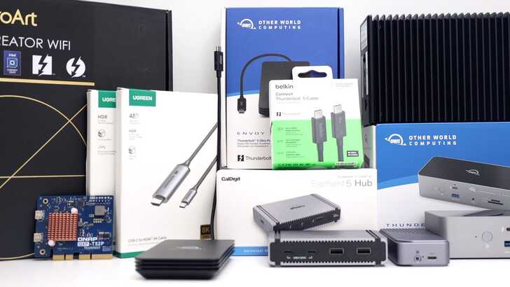 擺在桌上這些超過 25 萬價值的科技產品,有些是台灣沒有賣,有的還在研發中(還沒上市)的產品,所以我實在很難條列每項商品多少錢,粗估大概是 25~30 萬吧,但總之為了這集 Thunderbolt 5 也是要價不菲了。