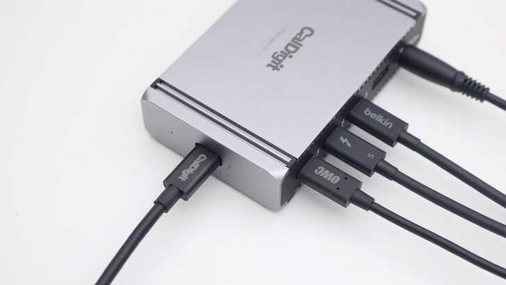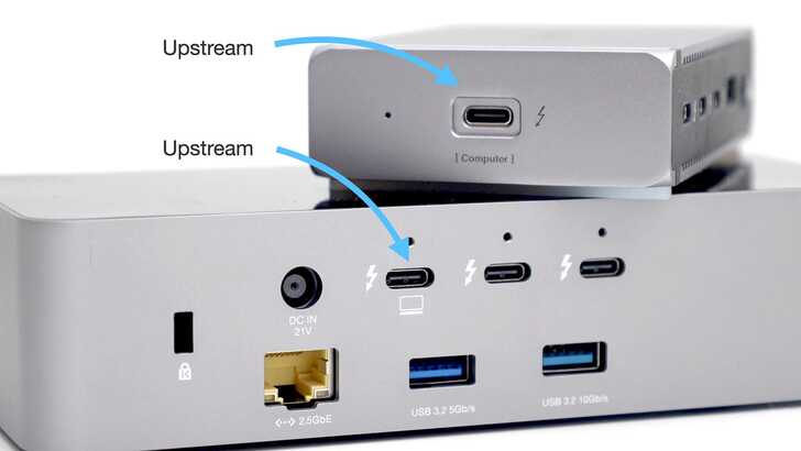 使用 Dock 的話,要注意產品通常有 upstream 和 downstream 之分,電腦要插在 upstream 的位置才能運作。以 CalDigit E5 來說就是側邊有標示「Computer」,以 OWC 來說就是背面有標示「電腦 icon」。插錯的話,Dock 功能無法建立 TBT5 連線。