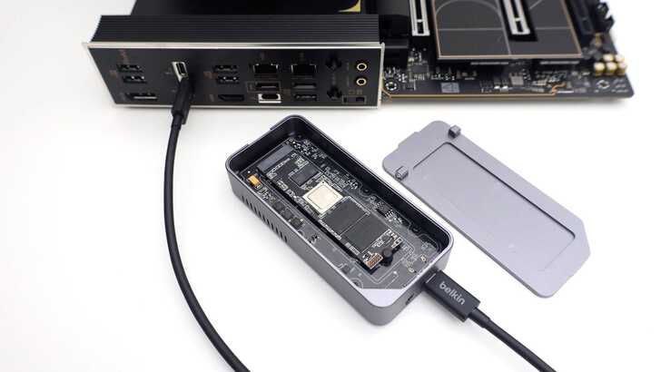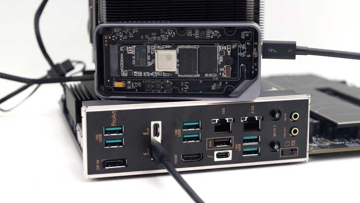 裡面是 12 條 PCIe Gen4 x4 2TB SSD,全部透過 PCIe Gen4 x2 連接,經過 Microchip PM40028 這顆 PCIe Gen4 Switch,再經由 Thunderbolt 晶片 Intel JHL9480 與電腦連接,達到 Thunderbolt 5 的速度。
