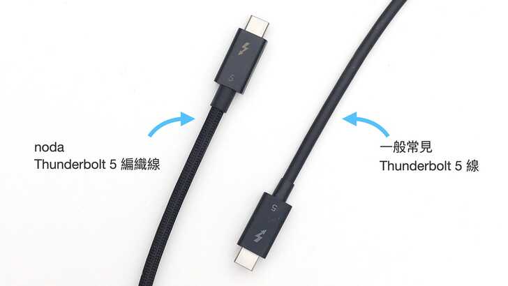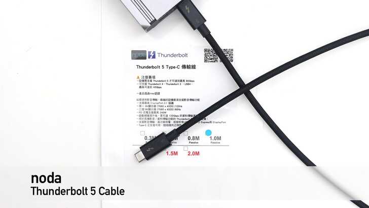 另外我手上還有 noda 的 Thunderbolt 5 Cable,他們提供 30 公分到 1 公尺長度的選擇,未來可能會到 2m。這個線的質感是真的好,而且有過 Thunderbolt 5 認證,不是那種標著 USB4 的線。