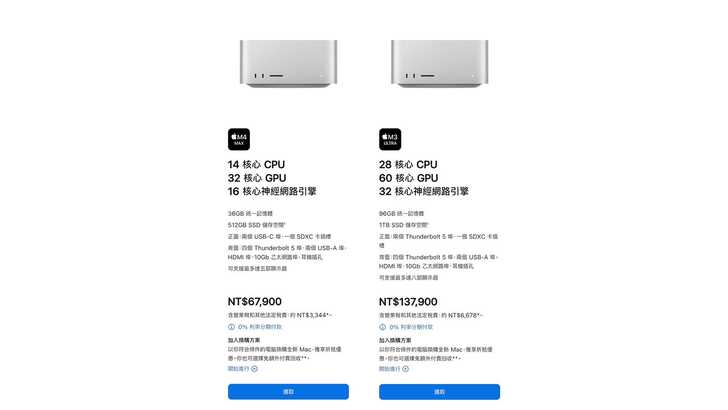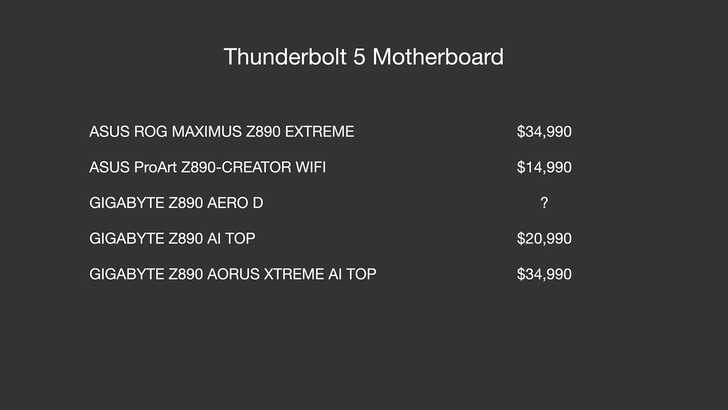 除了自己組桌機,目前要比較便宜用到 Thunderbolt 5 另一個做法,就是買 Mac 生態。例如 Mac Studio M4 Max 或是 MacBook Pro M4 Pro,都是 $67,900 起跳,原生支援 Thunderbolt 5。Apple 的做法是把控制晶片整合在 SoC 裡,搭配 retimer。Windows 筆電目前有 Thunderbolt 5 的款式不多,像是 Razer Blade 18 大概 $85,000,或是 MSI 有好幾台,只是我都沒摸過。另一個台灣沒有賣是 Maingear。
