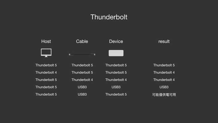 關於相容性上真的是個大哉問,很多東西就是要實測才知道他是不是真的能動。簡單來說,首先就是要確保自己的電腦、連接線、外接裝置都要是 Thunderbolt 5。如果是 Thunderbolt 3、USB 通常不會動,除非他有類似 UNITEK S1253A 做雙模。如果是 Thunderbolt 4 / USB4,可以動,但速度只會有 PCIe Gen3 x4 的等級。