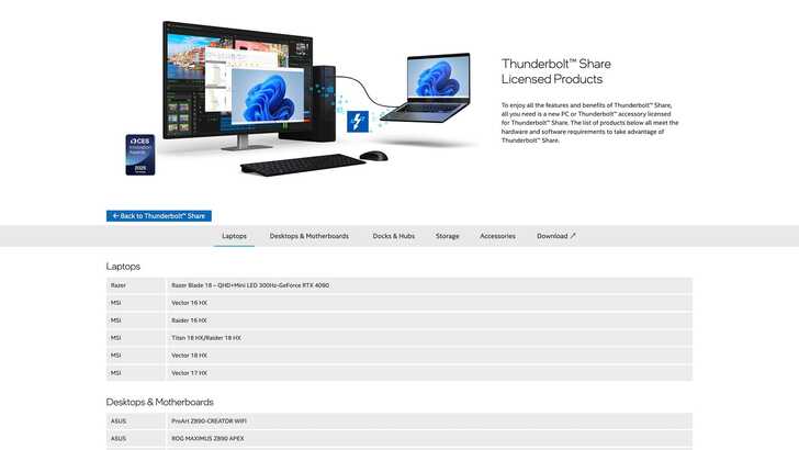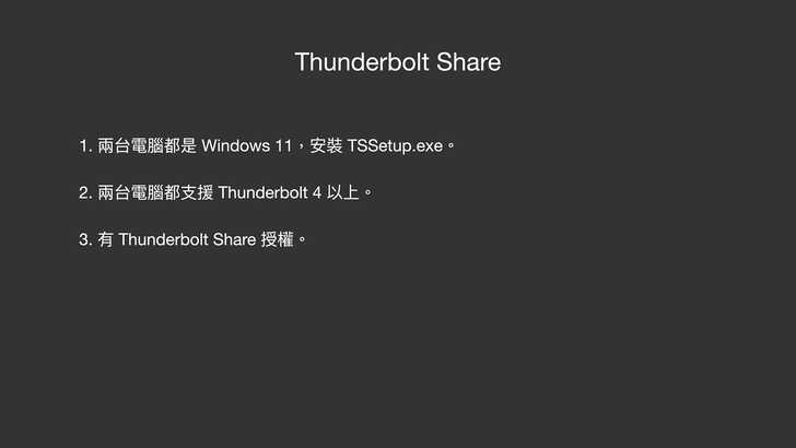 這個授權有可能是主機上自帶,只要一台主機自帶就可以。或是有些 Thunderbolt Dock 裡面帶有這個授權,也可以用。但前面兩個前提還是要符合。而這個 Thunderbolt Share Licensed Products,可以在這個網頁找到。雖然 Intel 原本宣傳是說電腦或 Dock,但網頁中「Storage」的部分寫 Coming soon,不知道是不是代表未來可以透過 Storage 的 downstream daisy chain 下去,直接接到另一台電腦?