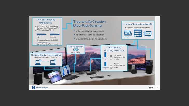 技術上有一點大家比較少提,早期 Thunderbolt 不管是 PC 還是 Mac,Thunderbolt 可能是只有一個匯流排的設計。雖然孔看起來是兩個,但其實兩個是共用一個頻寬。這邊基本上沒有 AMD 什麼事,因為 Thunderbolt 就是 Intel 和 Apple 在推。而 Mac 之前 CPU 是用 Intel 硬體,所以 PC / Mac 兩邊硬體狀況是一樣的,除了 Apple 在中高階款有額外拉匯流排給額外的 Thunderbolt。後來轉到 Apple Silicon 時代,Apple 基本上一個孔就是一個 Bus,不用考慮太多。而 Intel 是到 Alder Lake,也就是第 12 代,主機板上兩個 Thunderbolt 就是獨立的 Bus。所以現在 Z890 看到的兩個 Thunderbolt 5,其實他就是兩個獨立的 PCIe Gen4 x4,彼此不會佔用到對方速度。