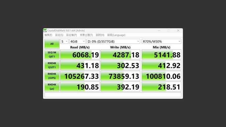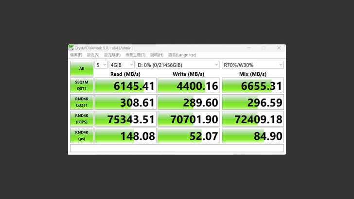 實測循序讀寫可以達到 6,145MB/s 和 4,400MB/s。而且他是 fanless 的設計,所以運行起來非常靜音,主要透過機殼散熱,因此可以看到外觀是很多鰭片的造型。
