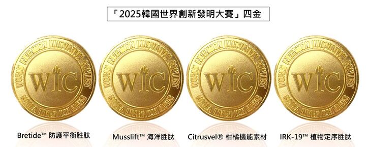 綠茵生技於 2025 年第 11 屆韓國首爾「世界創新發明大賽」(World Invention Innovation Contest, WiC)再度贏得國際榮譽,憑藉自主研發的四大創新保健原料—Bretide™ 防護平衡胜肽、Musslift™ 海洋胜肽、Citrusvel® 柑橘機能素材及IRK-19™ 植物定序胜肽,一舉奪下四面金牌,獲得國際評審一致肯定,再度展現了綠茵生技在全球保健食品原料領域的領先創新實力。
