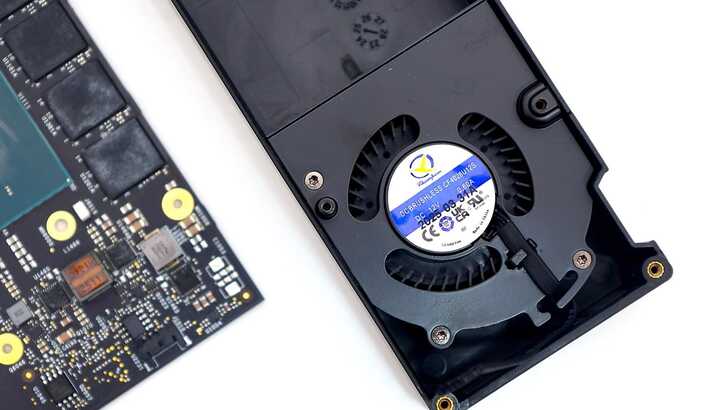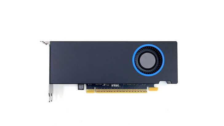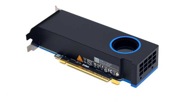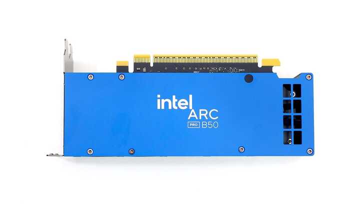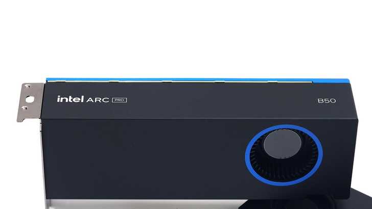 塑膠殼側邊寫著 Intel Arc Pro B50。並有著半肩高度,安裝到伺服器不會有問題。厚度採用雙槽的厚度,並採用渦輪扇。外觀上,渦輪扇旁的藍圈,也起到了畫龍點睛的效果,讓整著卡的表情更生動、更有科技感。