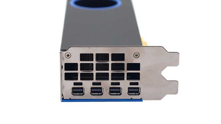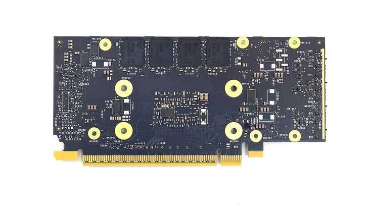 背面也有四顆記憶體顆粒,四顆都有導熱貼片與藍色的背板貼合,幫助散熱。整張卡功耗 70W,透過 PCIe 供電即可,不需要額外連接電源線。