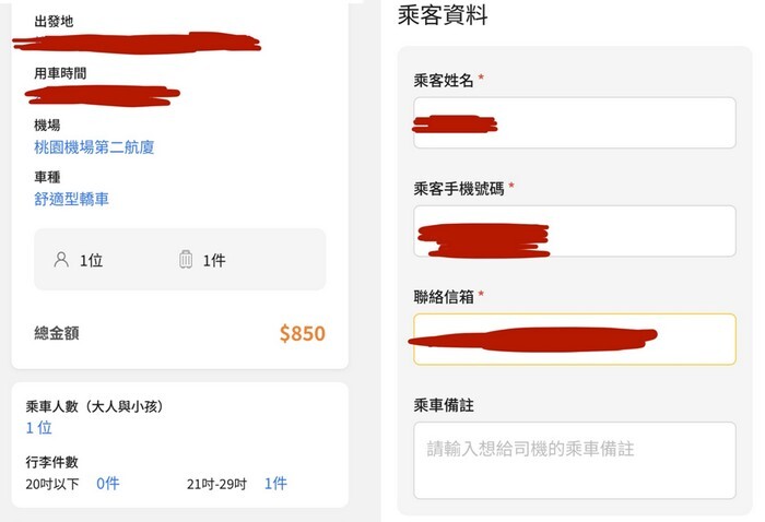 下一步就會再次確認資料、金額、人數、行李數,接著再填寫姓名、手機號碼、信箱,如果有需要備註的話也可以填寫在下面