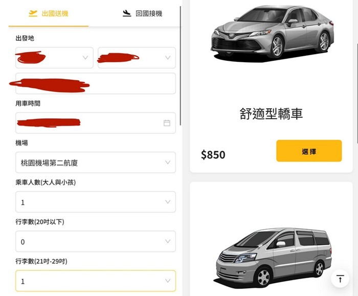 看你是要點選出國還是回國機場接送,點進去之後就可以開始填寫資料,再來就是選車型,有分成轎車和商務大車,但因為我都是一個人出差,所以只需要選轎車就好了