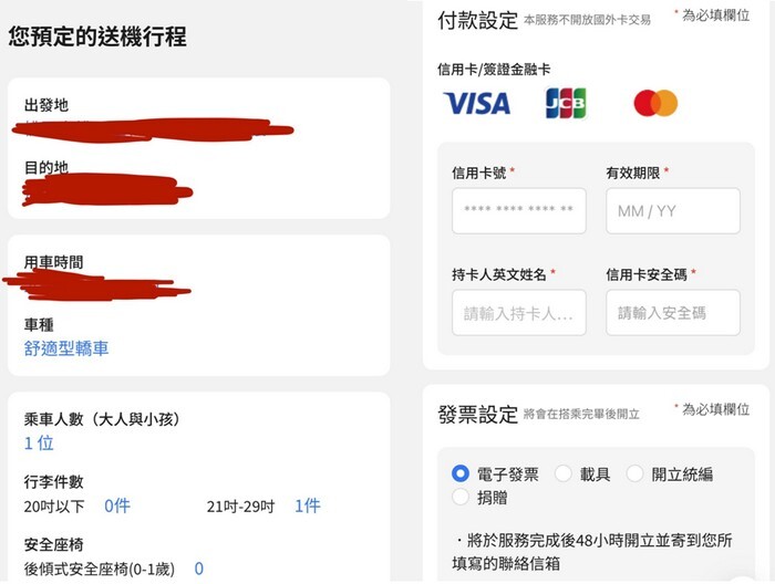 最後一步就是確定行程,還有輸入信用卡的卡號,如果需要統編的話也可以直接填寫在裡面