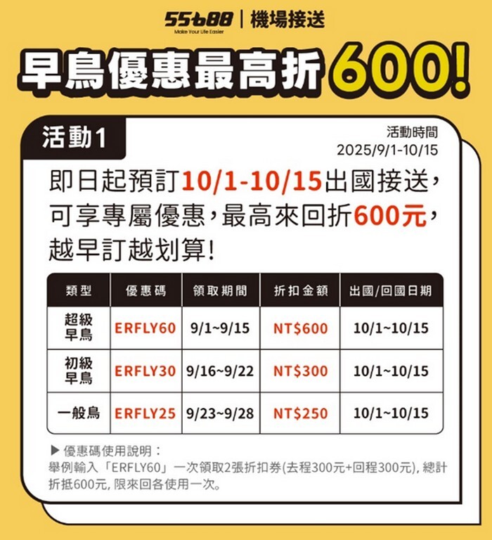 今年 10/1 到 10/15 出國的人,如果提前預定機場接送,可以享有最高 600 元的折扣,活動有三個階段,9/1 到 9/15 輸入 ERFLY60 可以折 600 元,9/16 到 9/22 輸入 ERFLY30 折 300 元,9/23 到 9/28 輸入 ERFLY25 折 250 元,我覺得這個早鳥優惠對常出差的人很實用,因為反正一定會用到機場接送,提前預約還能省一筆