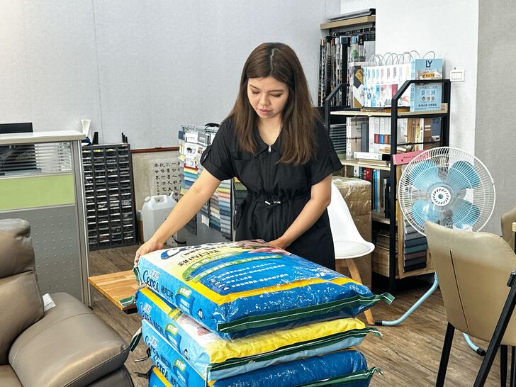 店家整理即將送往動保團體的寵物糧食(圖/美麗家傢俱生活館提供)
