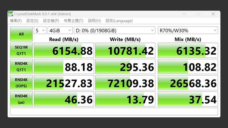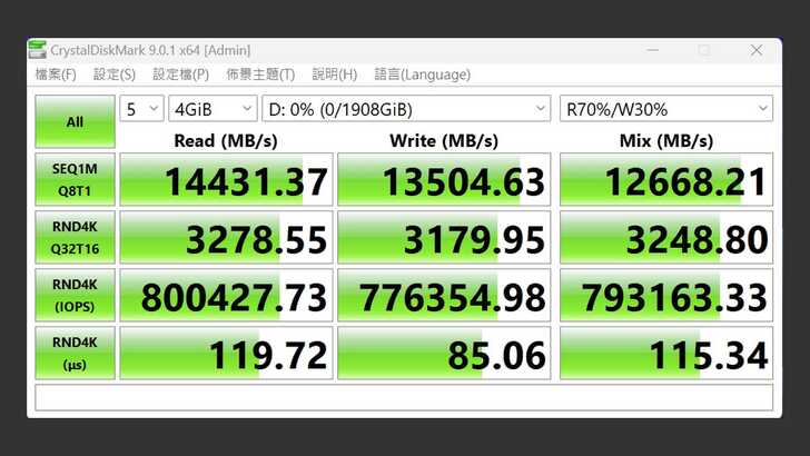 在 CrystalDiskMark 中,設定測試為五次 4GiB。最佳效能的設定下,循序讀取速度達到 14,431MB/s,循序寫入速度有 13,504MB/s,混合讀寫速度有 12,668MB/s。官網標示讀取 14,000MB/s、寫入 13,000MB/s 都有真實達到。RND4K 不管是讀取、寫入還是混合讀寫,也都有 3,000MB/s 左右的表現,RND4K IOPS 的表現也很好。
