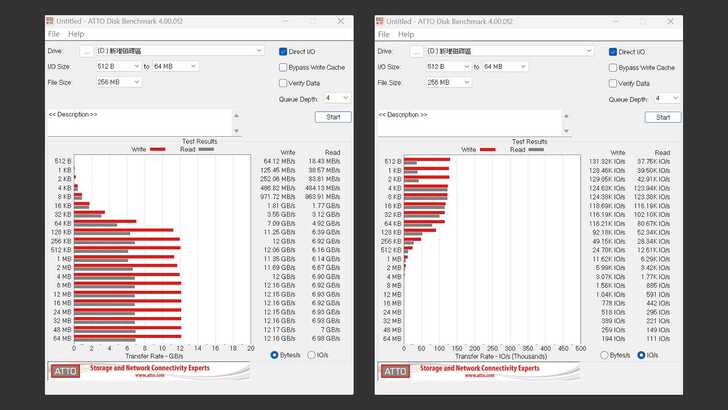 在 ATTO Disk Benchmark 中,讀取在 6.9 GB/s 左右,寫入則大約在 12GB/s 左右。
