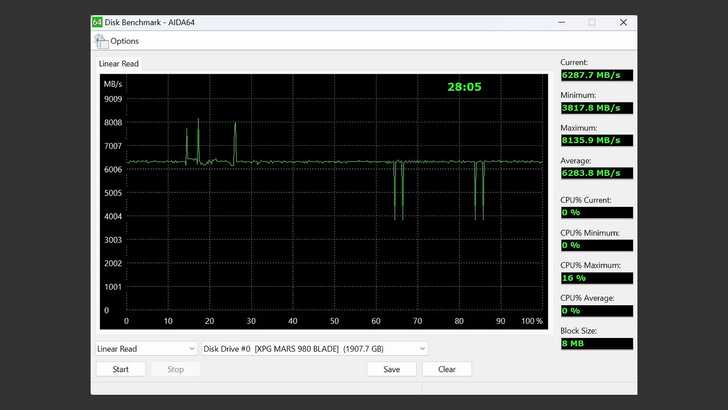 在 AIDA64 Disk Benchmark 中的 Linear Read,Block Size 為 8MB。速度在 6,300 左右,偶爾有上去一點、下去一點,但還算穩定。相對於採用類似方案的 SSD,雖然平均數值略低,但是讀取整體表現還可以,整體平均有達到 6,283MB/s。