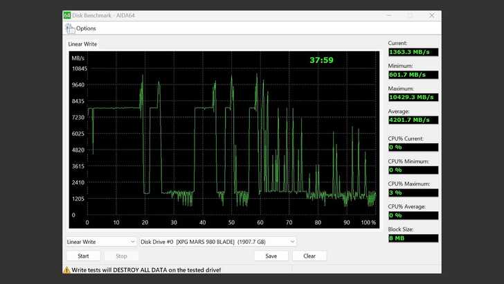 在 AIDA64 Disk Benchmark 中的 Linear Write,Block Size 設為 8MB。前面間歇性地出現短暫掉速,是 SMI 這個方案常見的現象。看來在前半段都相對有機會維持在 8,000MB/s 左右的速度,偶爾會掉到 1,600MB/s 休息。後面則維持在 2,000MB/s 左右,偶爾才會來高。雖然看起來極速不是非常高,且上下起伏比較大,但總體下來平均還是有 4,200MB/s 的寫入速度。