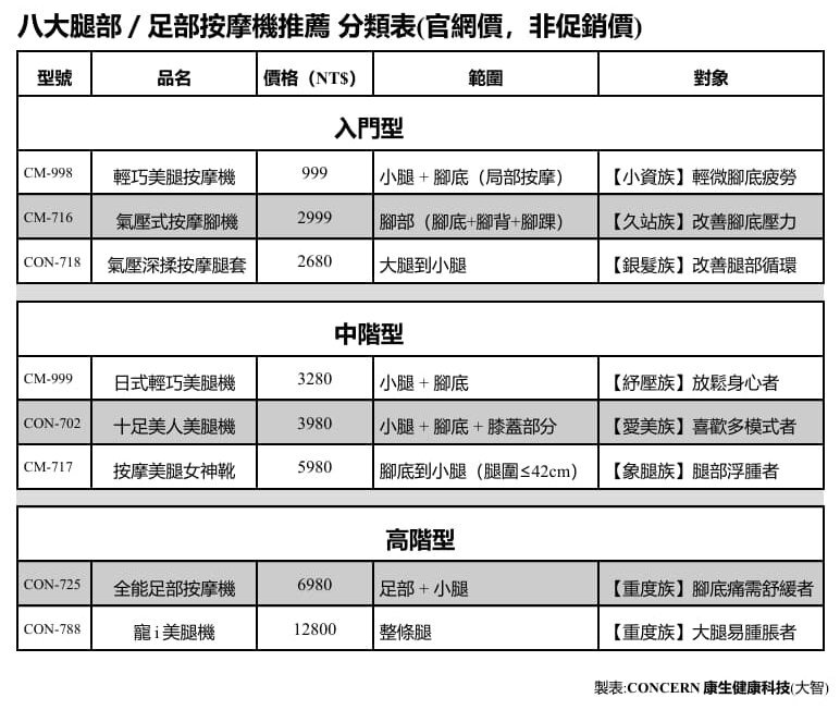 👉腿部(足部)按摩機 評比表