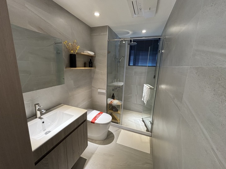 浴室的配備也很用心,有很多空間可以收納盥洗的那些瓶瓶罐罐,還有裝設Derek智慧馬桶和Panasonic五合一暖風機,換氣、乾燥、暖房一次搞定,洗完澡能快速乾燥,不會濕濕悶悶的!