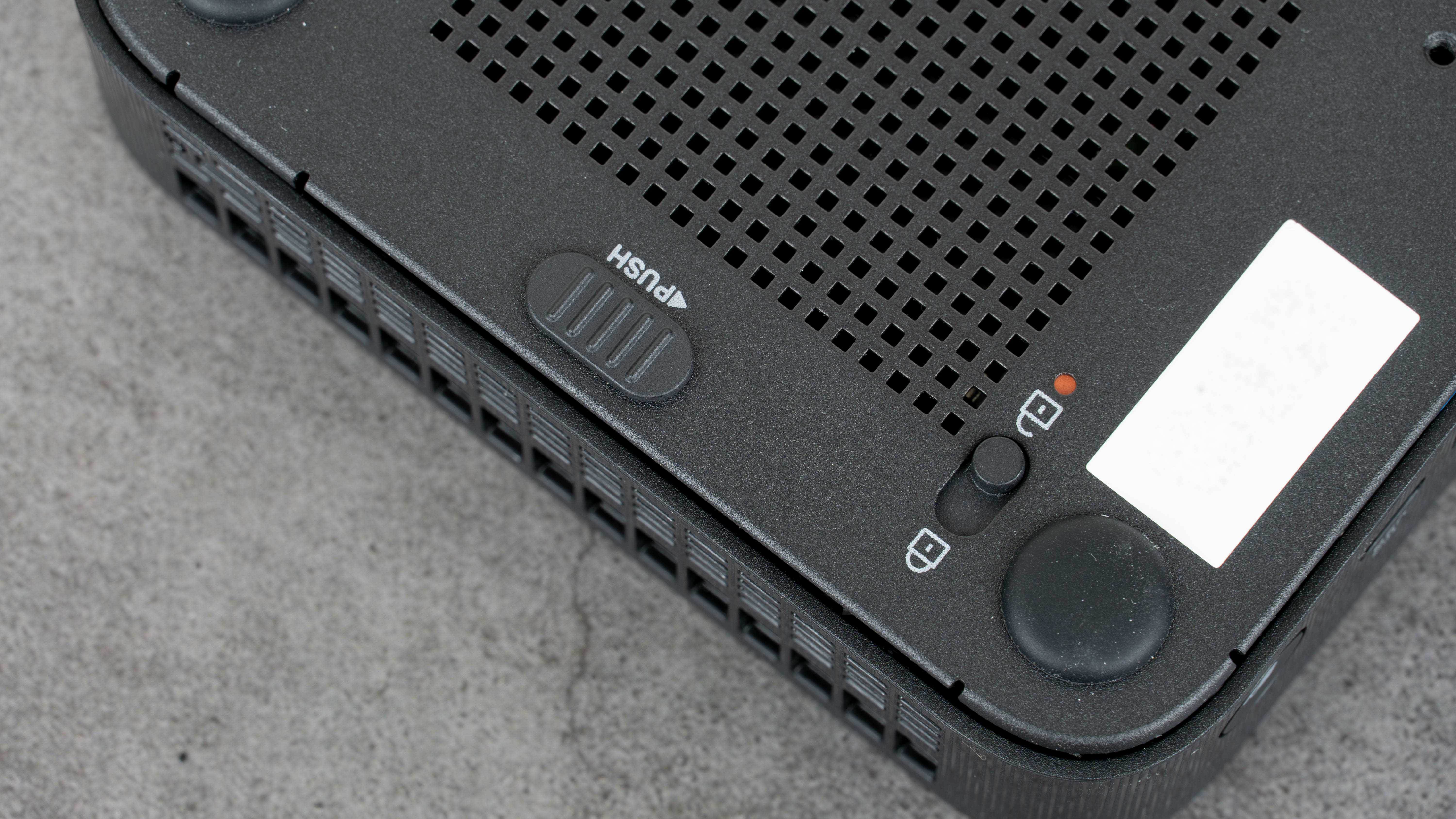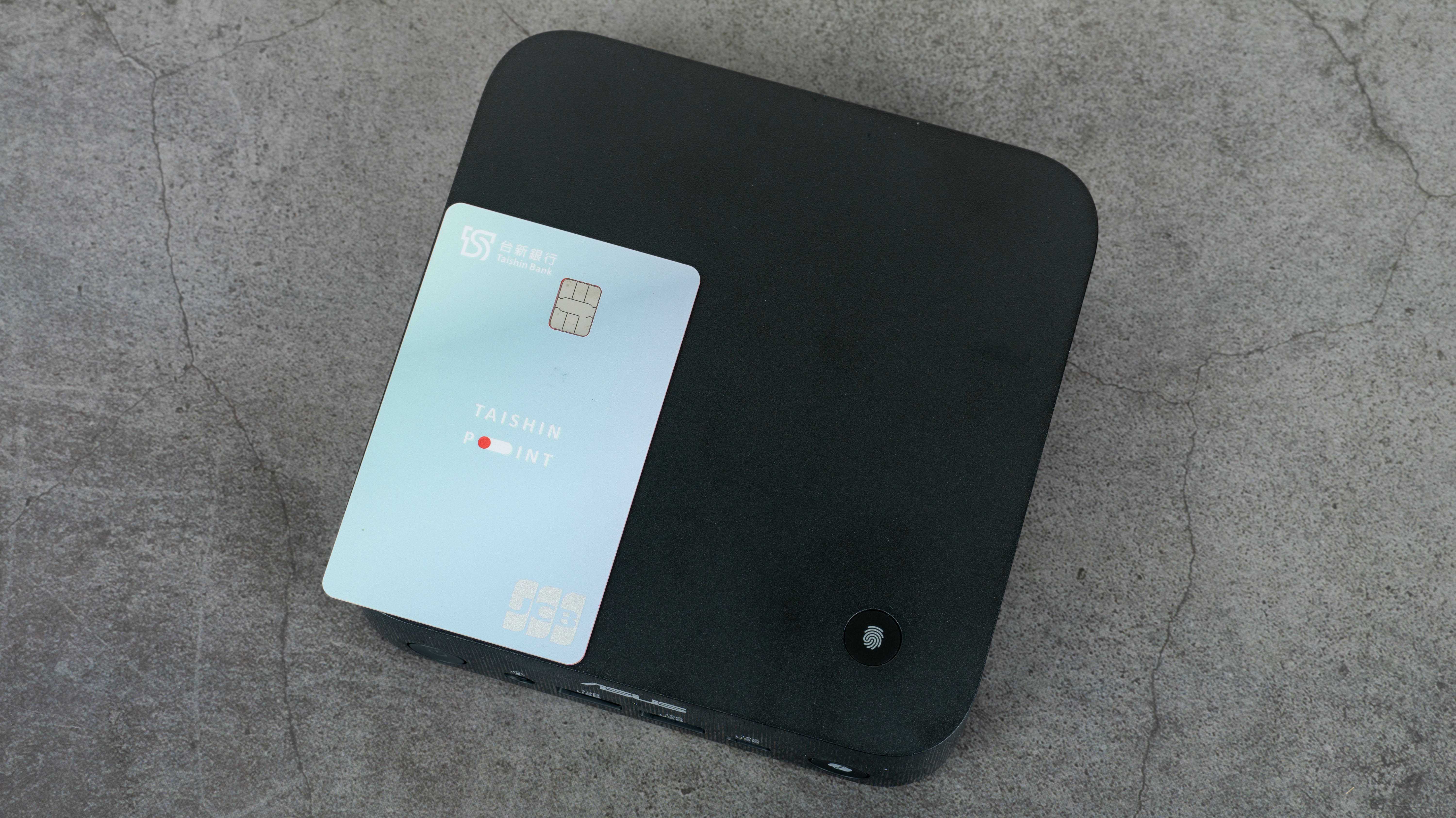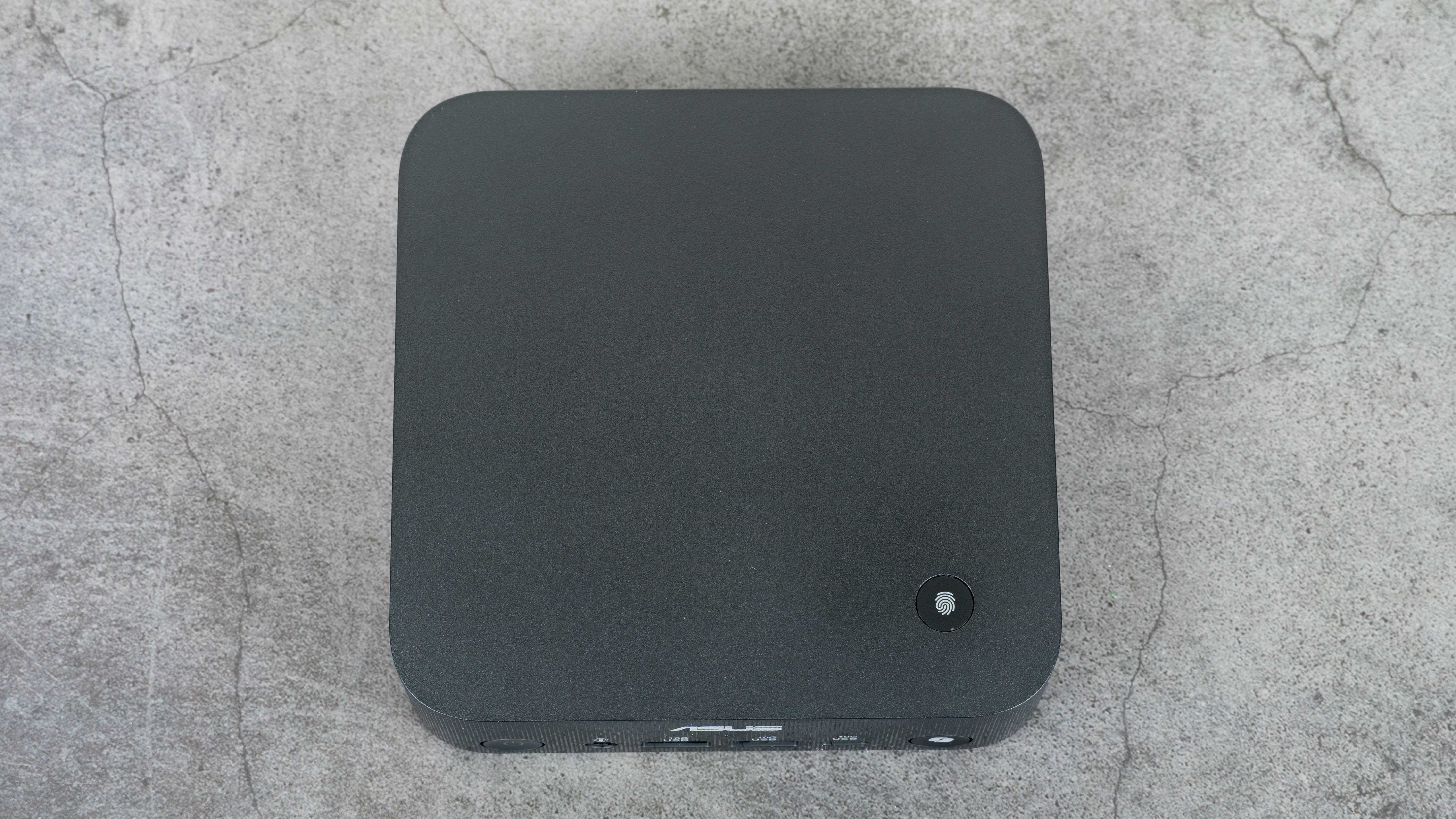 看到 ASUS ExpertCenter PN54 本體,顆粒紋路塑膠外殼,上方維持了 ASUS 的傳統放了一個指紋辨識。