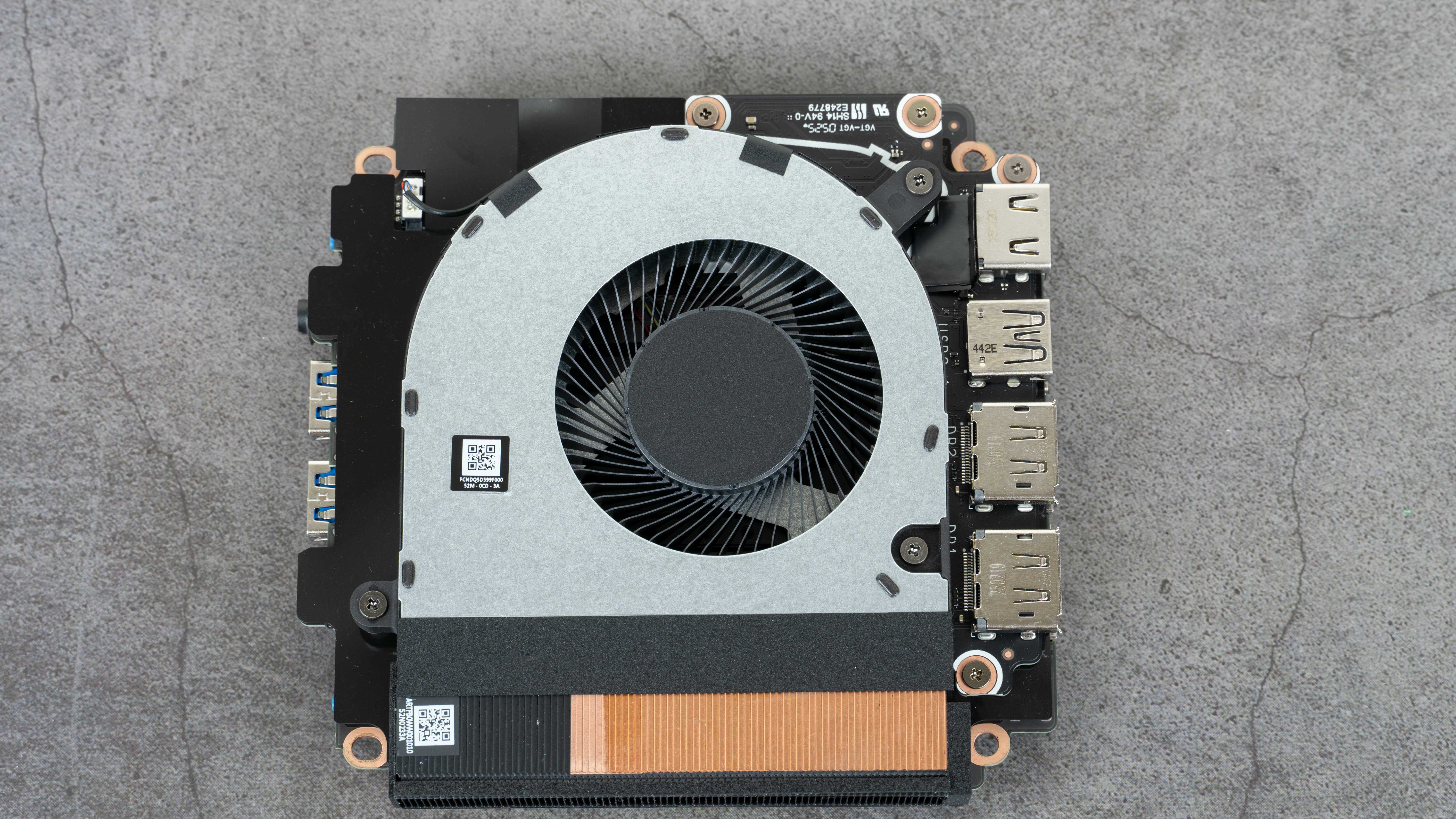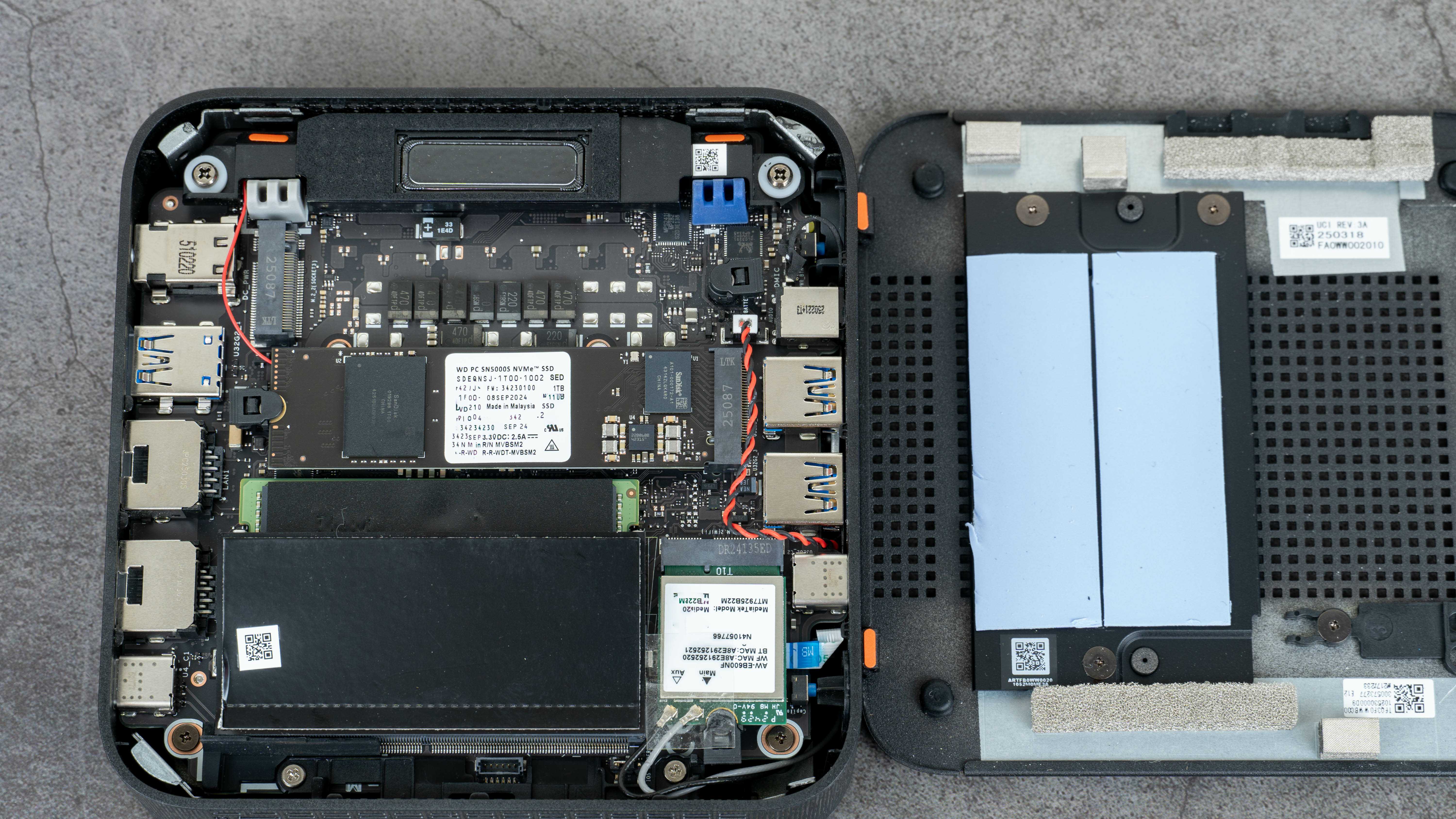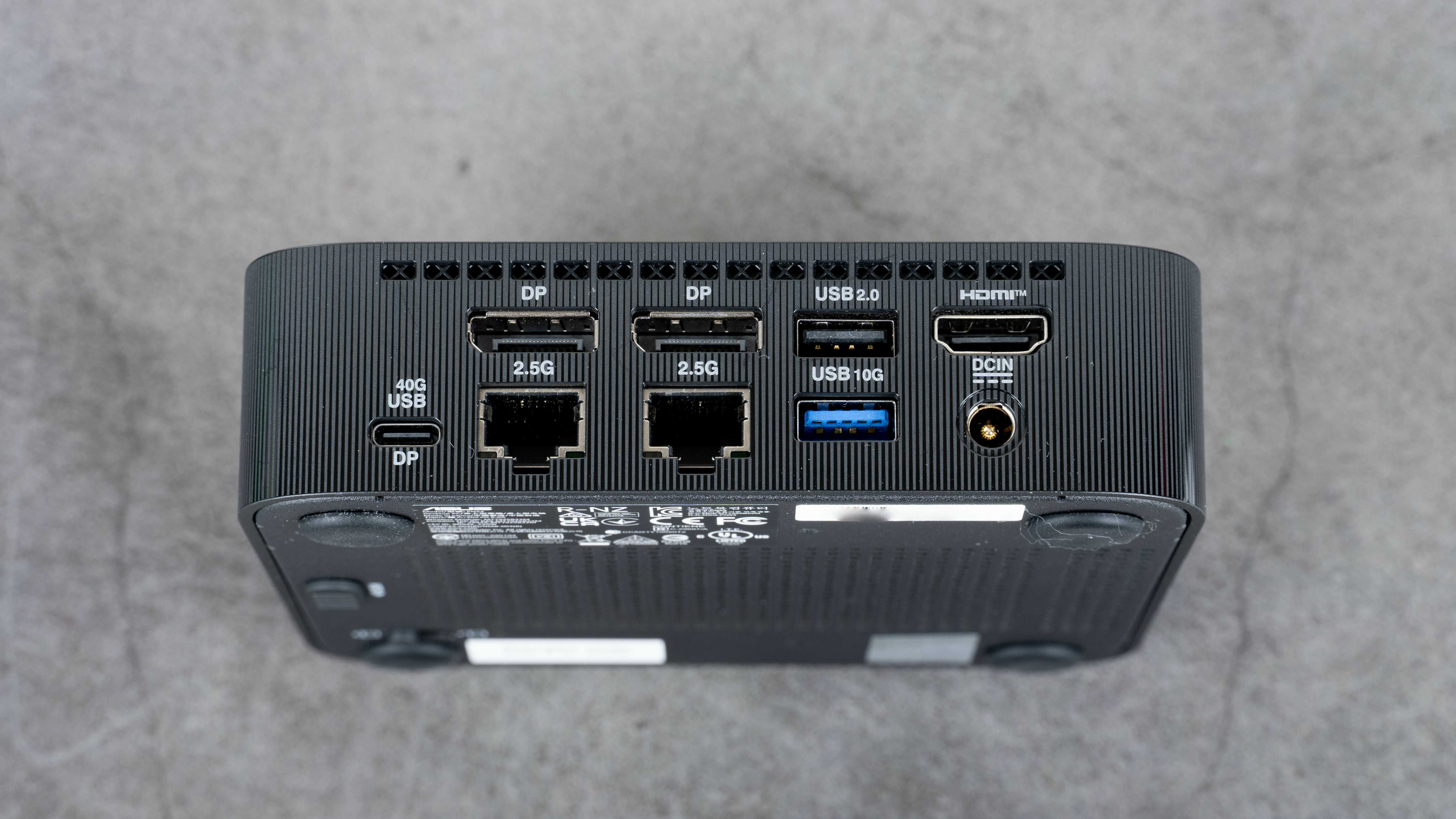 背面 I/O 一樣給好給滿,由左至右,由上而下分別是兩個 DisplayPort 1.4、USB 2.0 Type-A、HDMI 2.1(4K@60Hz)、USB 4.0 Type-C、兩個 2.5GbE RJ45 LAN、USB 3.2 Gen2 Type-A 和 DC 電源輸入。一個有意思的點是它給了兩個 2.5GbE 網路孔。對需要連接內網高速傳輸的公司用戶來說肯定很實用,但我猜大部分家用情境應該還是 Wi-Fi 一連了事。此外,一個 USB 4 的提供對於有高性能傳輸的用戶也是必不可少。