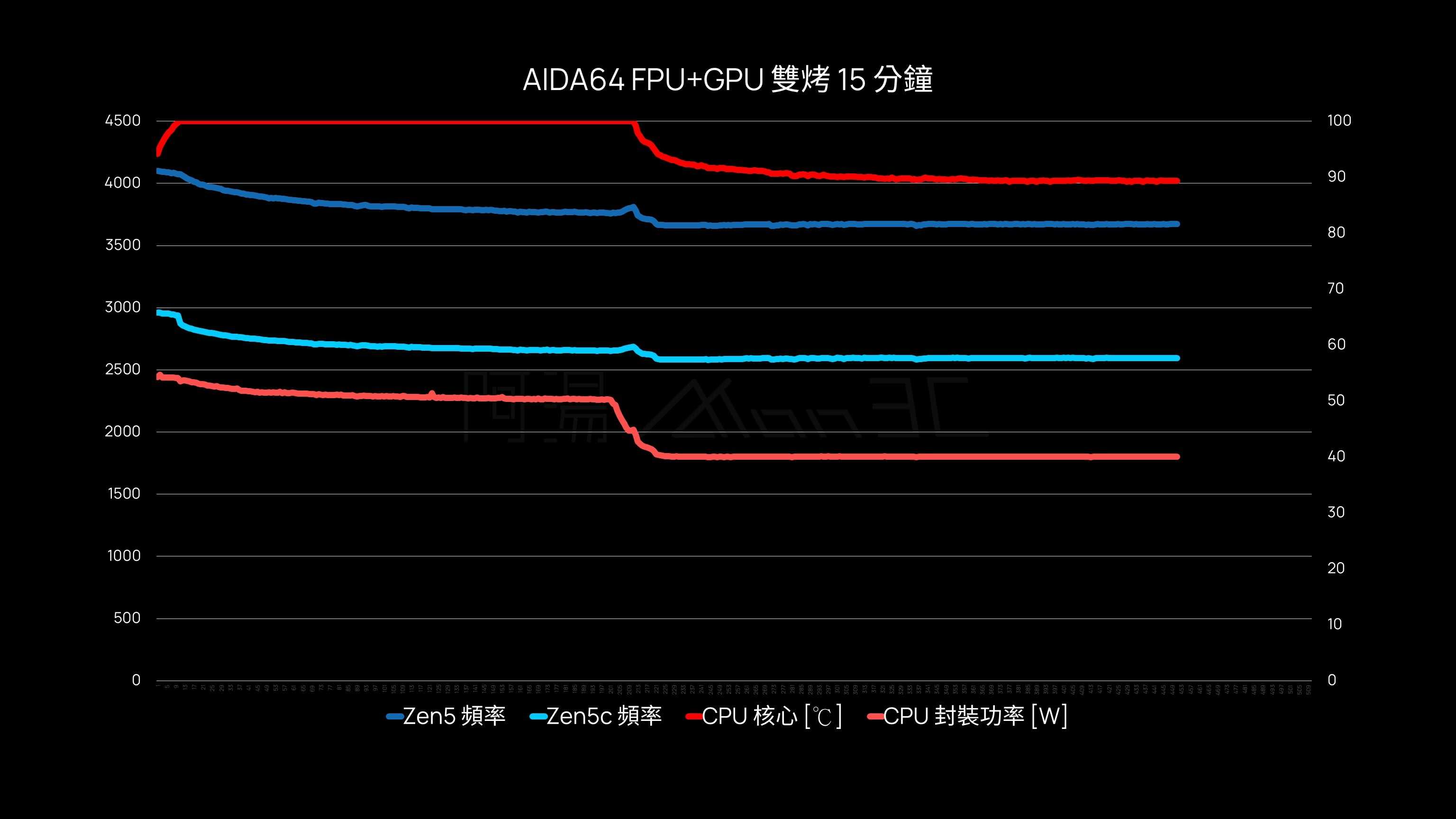 AIDA64 FPU 與 GPU 雙烤,呈現了類似的結果,只是這次撞牆的速度更快一些。最終 Zen5 CPU 大核心頻率停格在 3.7GHz,Zen5c 小核心停格在 2.6GHz。