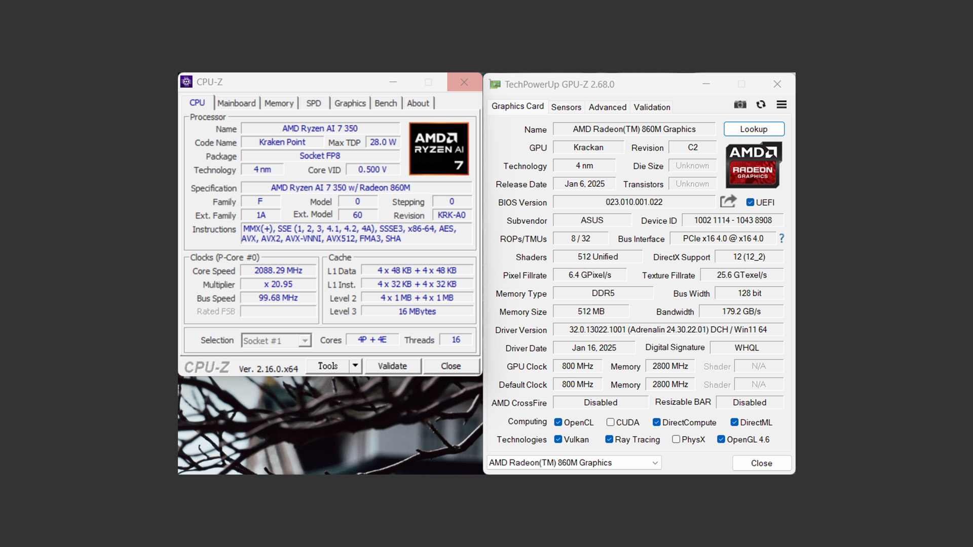 首先看到規格,AMD Ryzen AI 7 350,為 Zen5 架構的 CPU,4 顆 Zen 5 性能核搭配 4 顆 Zen 5c 能效核心。配備 Radeon 860M GPU,整體性能以辦公而言非常充足。