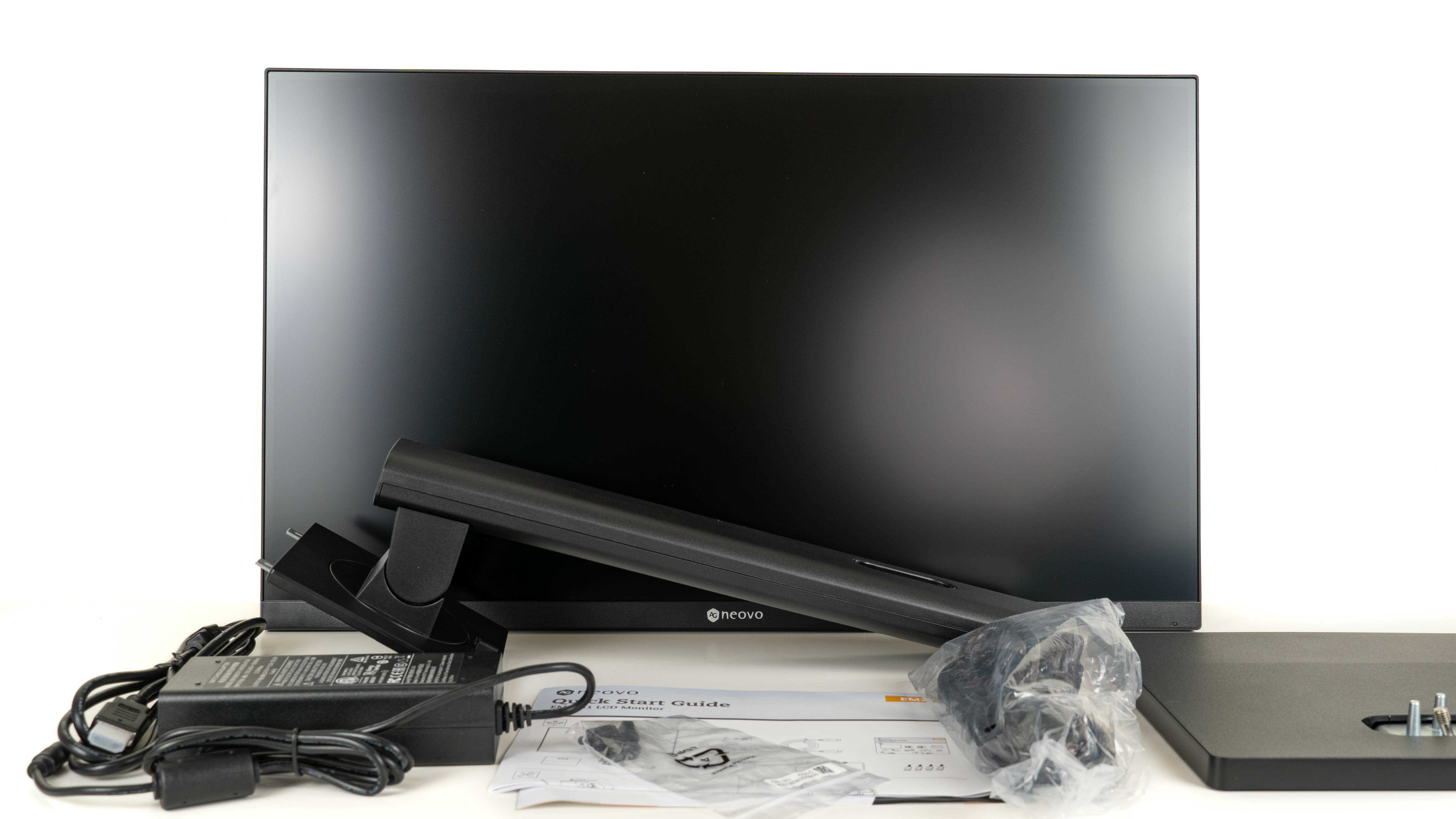 盒內配件一覽,包含螢幕本體、支架、底座、外置電源供應器、HDMI 與 USB-C 傳輸線、壁掛用銅柱及說明文件。