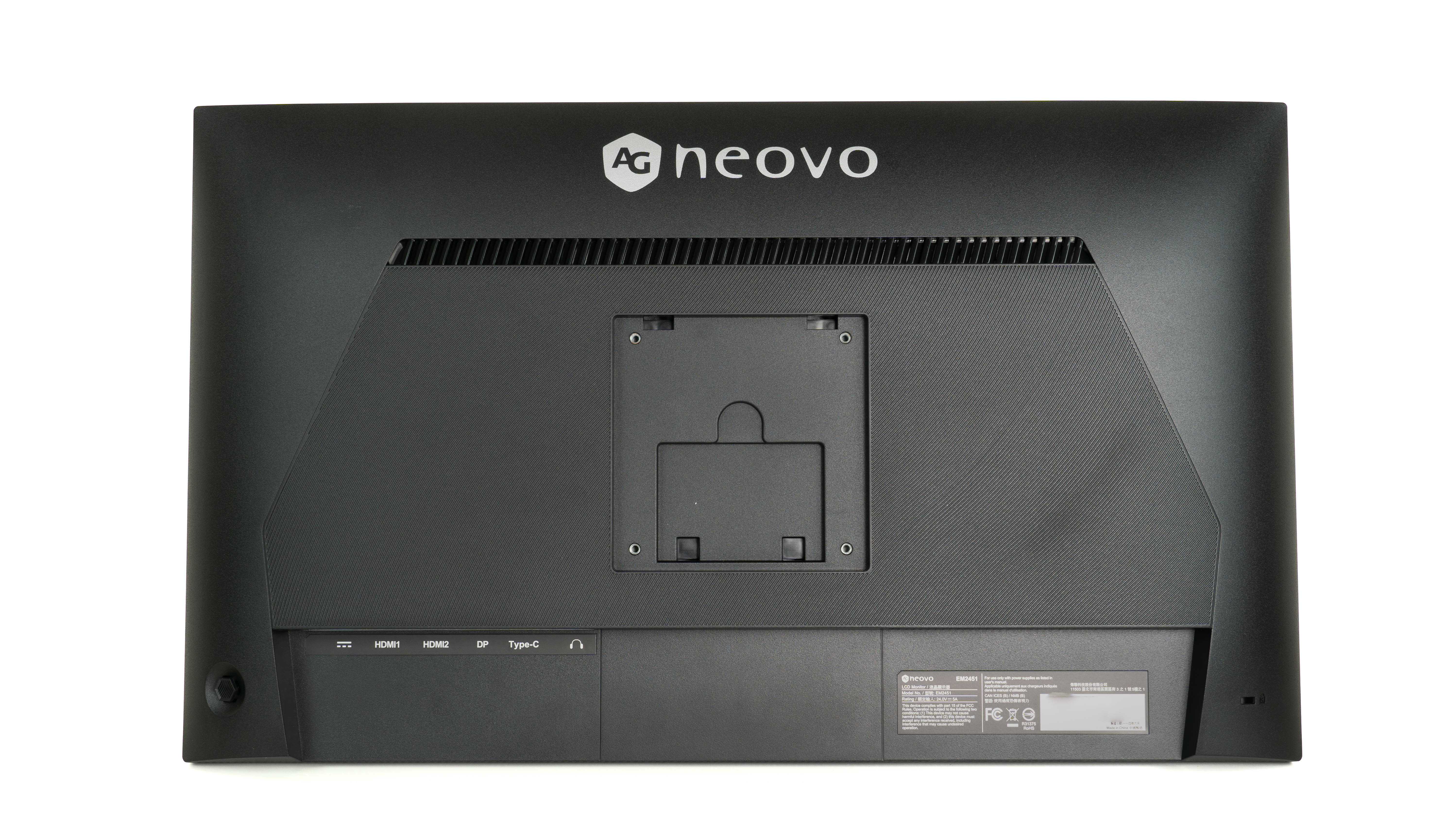 螢幕本體背面為霧面塑膠外殼,並支援 VESA 標準壁掛孔。
