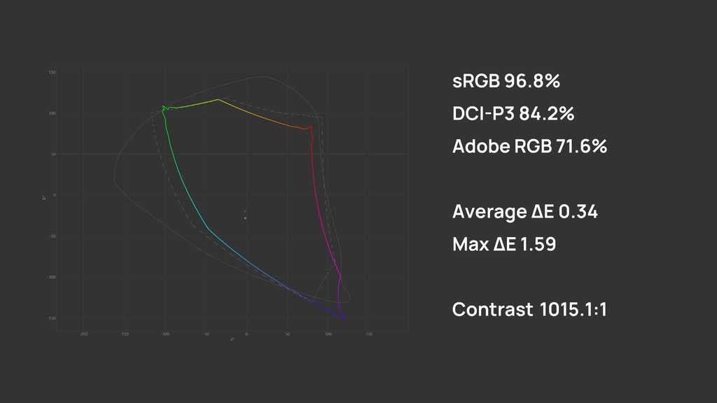 在色域表現上,官方標示 DCI-P3 93%。於 150 nits 亮度下實測,可達到 84.2% DCI-P3 與 96.8% sRGB 色域覆蓋。色準表現同樣出色,平均 ΔE 僅 0.34,最大 ΔE 為 1.59。