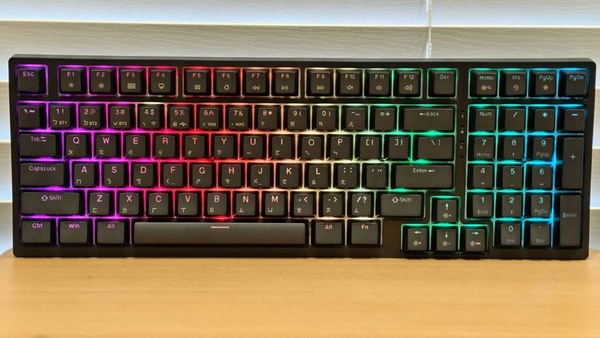▼Ultimus Pro為一款緊湊式98%佈局的電競無線鍵盤,通體為黑色,採用金屬上蓋設計,重量為998g,按鍵沉潛式,支援ARGB燈效,搭配內部透明定位板可讓燈光效果更為柔和