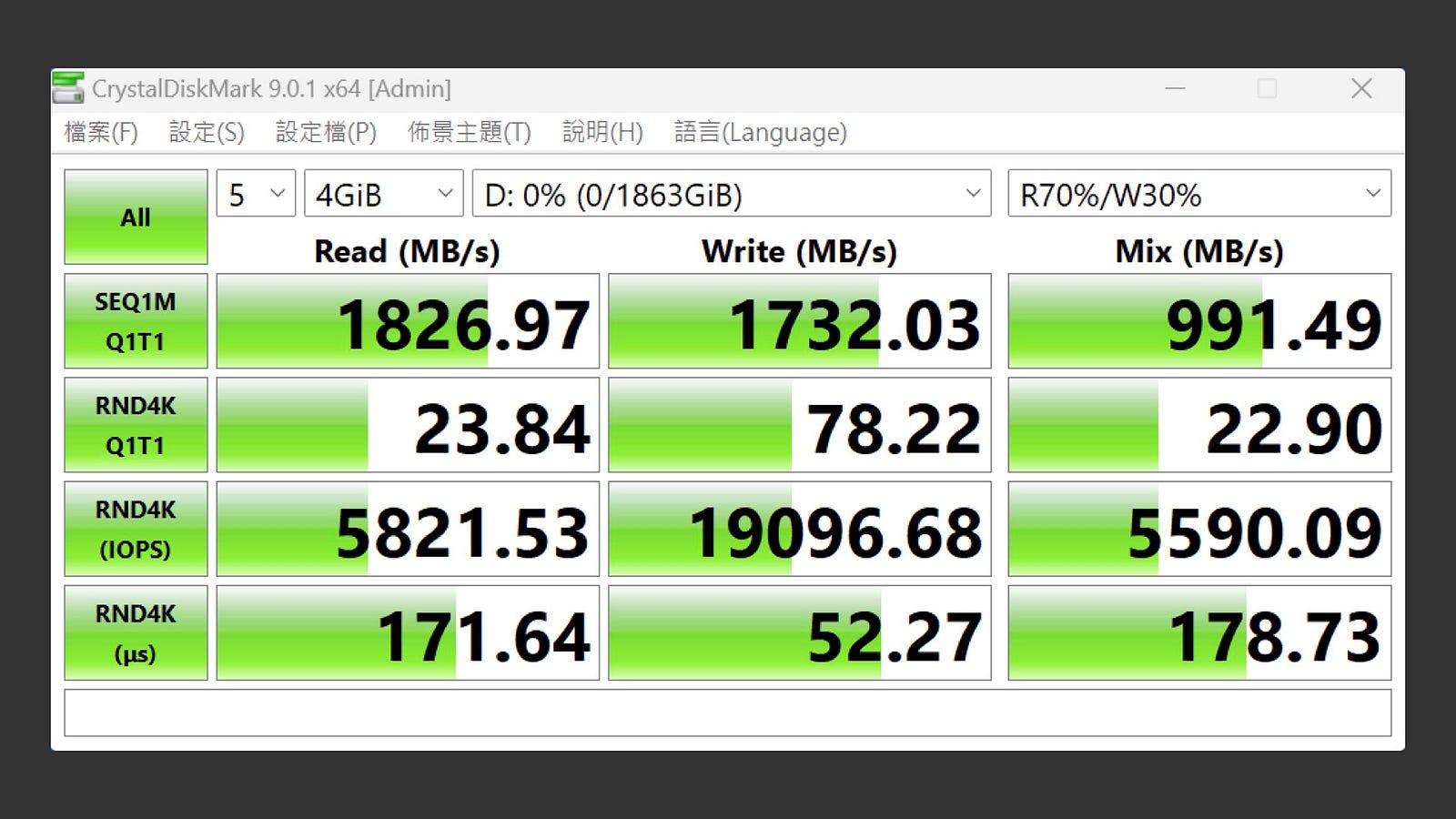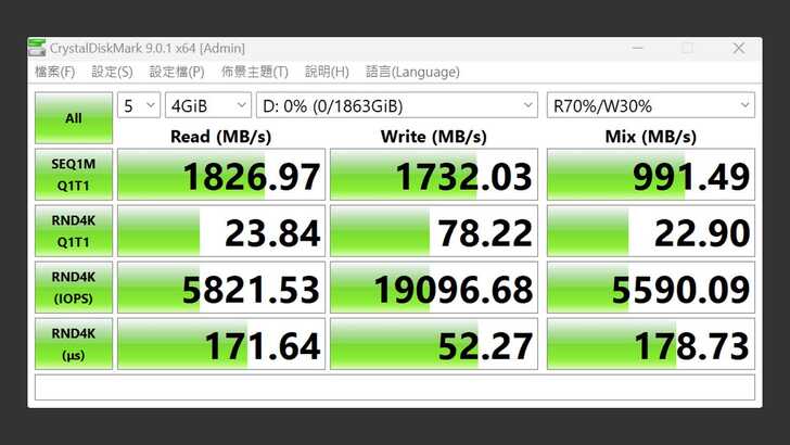 接著在 CrystalDiskMark 中,同樣設定測試為五次 4GiB,改為在真實世界的設定。循序讀取速度仍有 1,826MB/s 稍弱,循序寫入也還有 1,732MB/s,循序讀取和寫入表現都相當不錯。不過隨機 4K 讀寫依舊是軟肋。