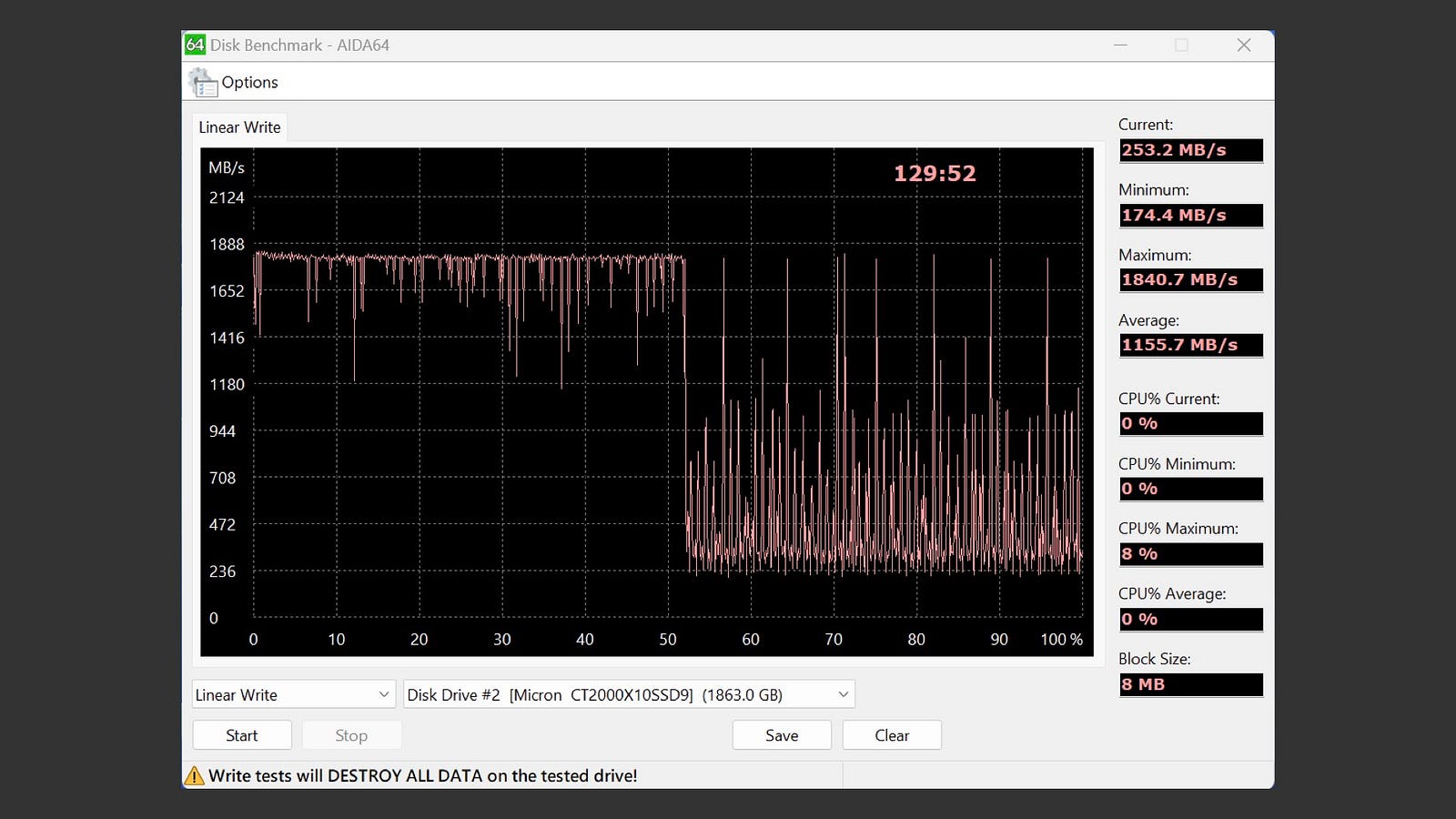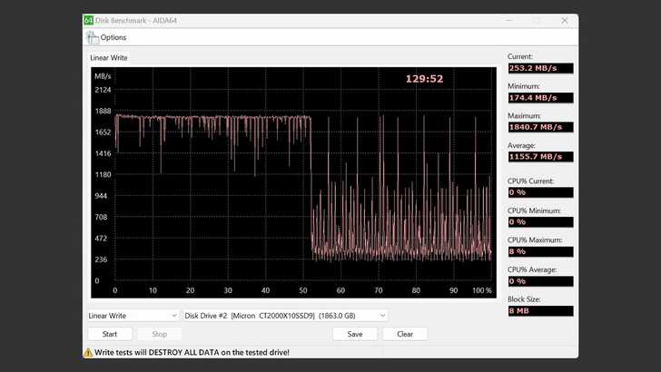 在 AIDA64 Disk Benchmark 中的 Linear Write,Block Size 為 8MB。看來前半段和後半段有明顯差異,前半段雖然有一些波動,但整體速度基本還可以在 1,800MB/s。後半段的速度看來是 230 MB/s 以上,偶爾會衝到 1,000MB/s 一下,最終平均為 1,155MB/s。