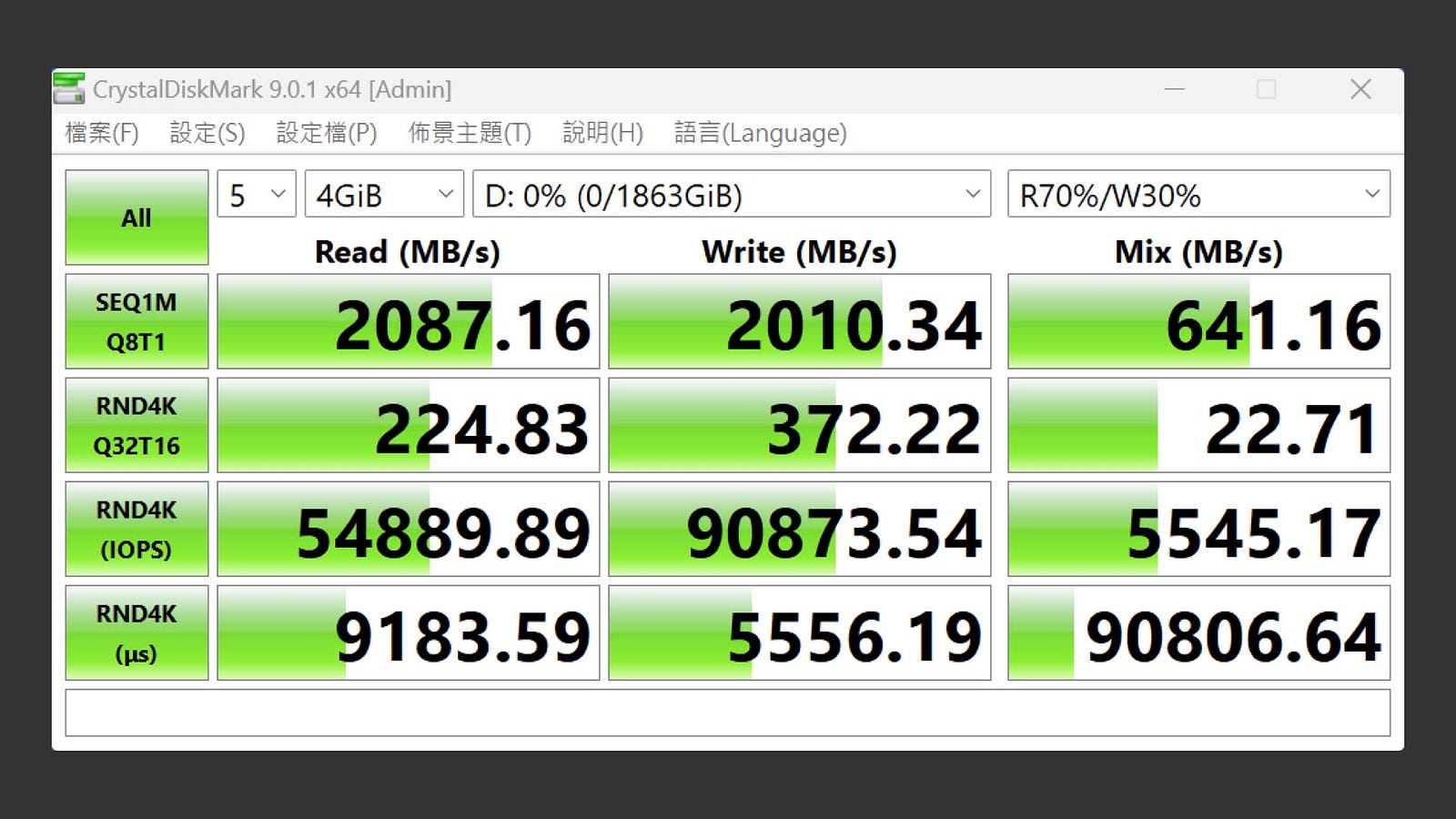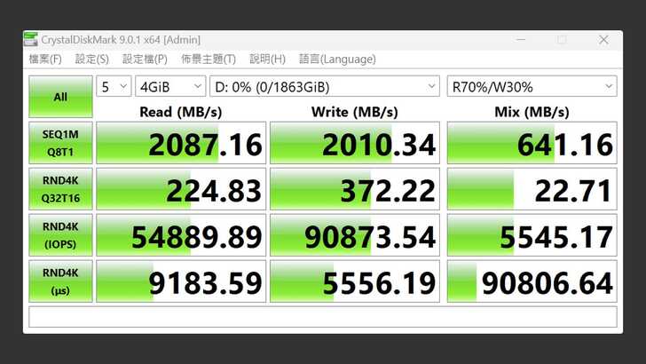 在 CrystalDiskMark 中,設定測試為五次 4GiB。最佳效能的設定下,循序讀取速度達到 2,087MB/s,循序寫入速度有 2,010MB/s,表現相當不錯,與標示速度差不多。不過混合讀寫速度只有 641MB/s,不及循序讀寫的一半。RND4K 在讀取、寫入為 200~380MB/s 之間,混合讀寫只有 22MB/s,稍嫌薄弱。