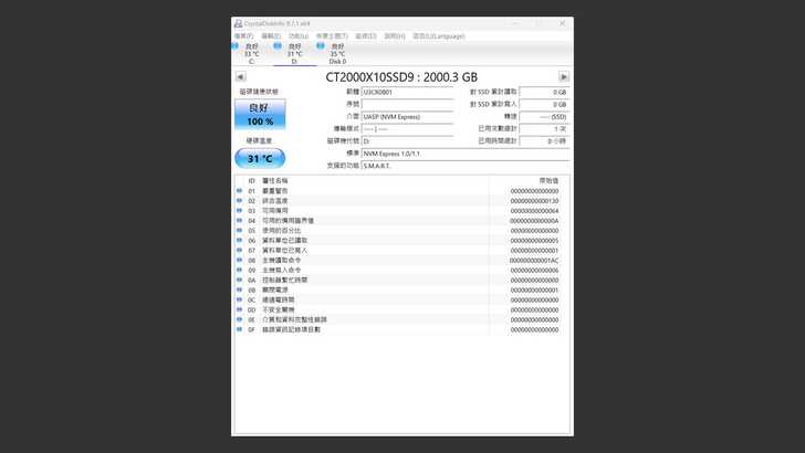 首先在 CrystalDiskInfo 中,可以看到 SSD 辨識出為 CT2000X10SSD9,容量 2000.3GB,韌體版本 U3CR0B01。