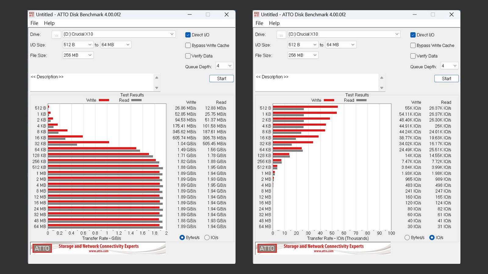 在 ATTO Disk Benchmark 中,讀取普遍在 1.94 GB/s 左右,寫入則大約在 1.89GB/s 左右,64KB 以上表現都滿不錯的。