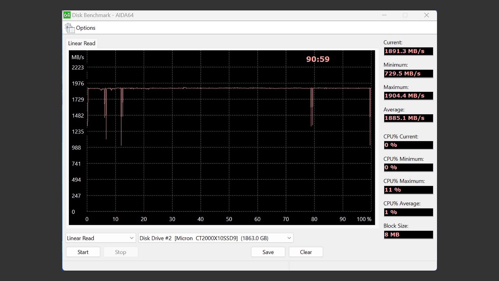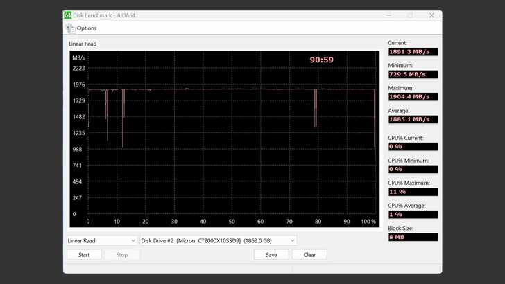 在 AIDA64 Disk Benchmark 中的 Linear Read,Block Size 為 8MB。速度在 1,900MB/s 左右,開頭、中間幾次往下掉了一下,但整體算滿穩定。平均速度為 1,885MB/s