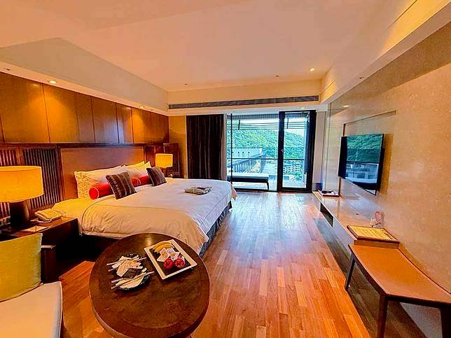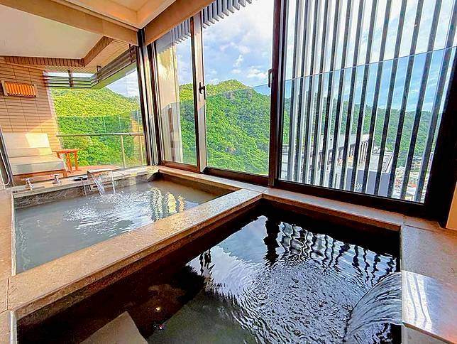 房型全數配備觀音石打造的冷熱雙湯池,泉質來自「大磺嘴第一口泉」,為極具代表性的白磺泉。無論入住「雅緻豪華客房」或「麗禧套房」,都能享受泡湯賞景的療癒體驗,浴池窗外盡是大屯山系綠意。飯店亦貼心提供嬰兒床、澡盆、奶瓶消毒鍋等親子備品,適合家庭同遊。