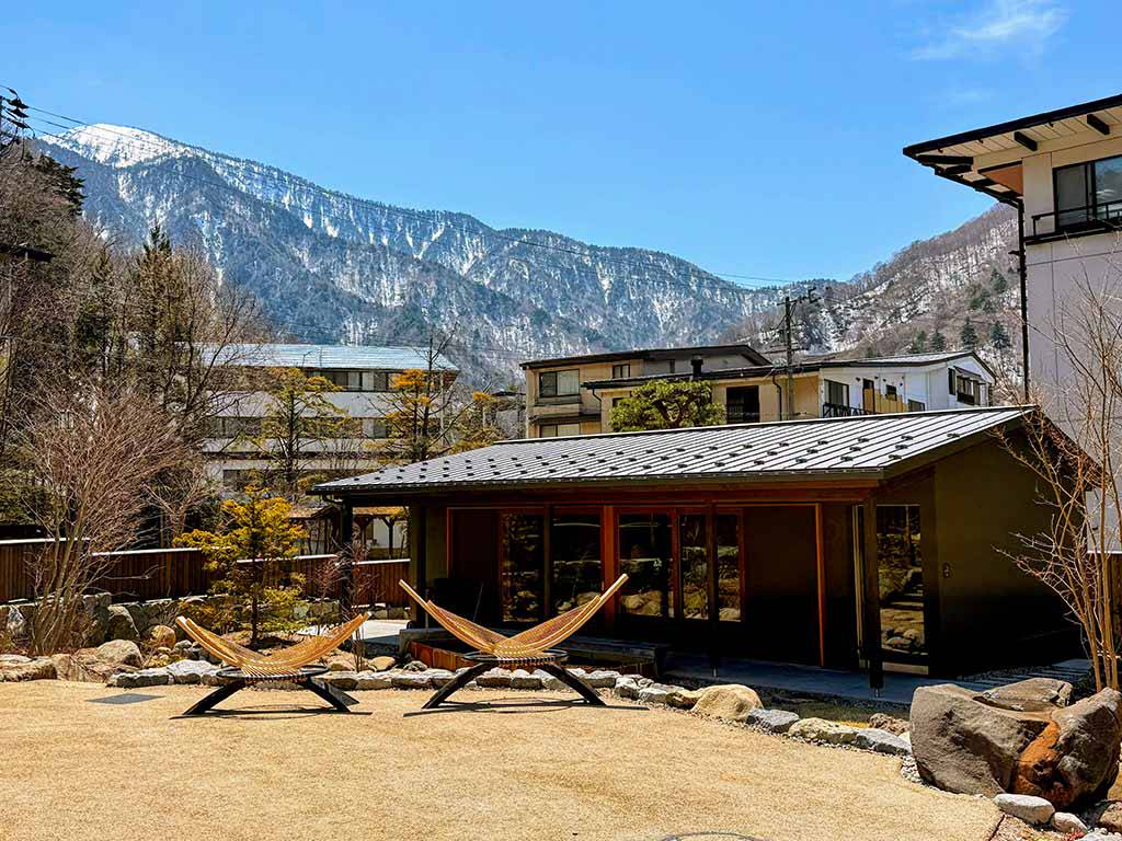 戶外中庭則延伸森林與山景意象,設有全年開放的 足湯池。冬季旅客可在此邊泡腳邊欣賞積雪山景,夏季則能感受綠意盎然的山林風光。中庭中央的「湯之川」會散出淡淡蒸氣,完整呈現奧飛驒溫泉鄉的地景特色。