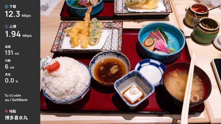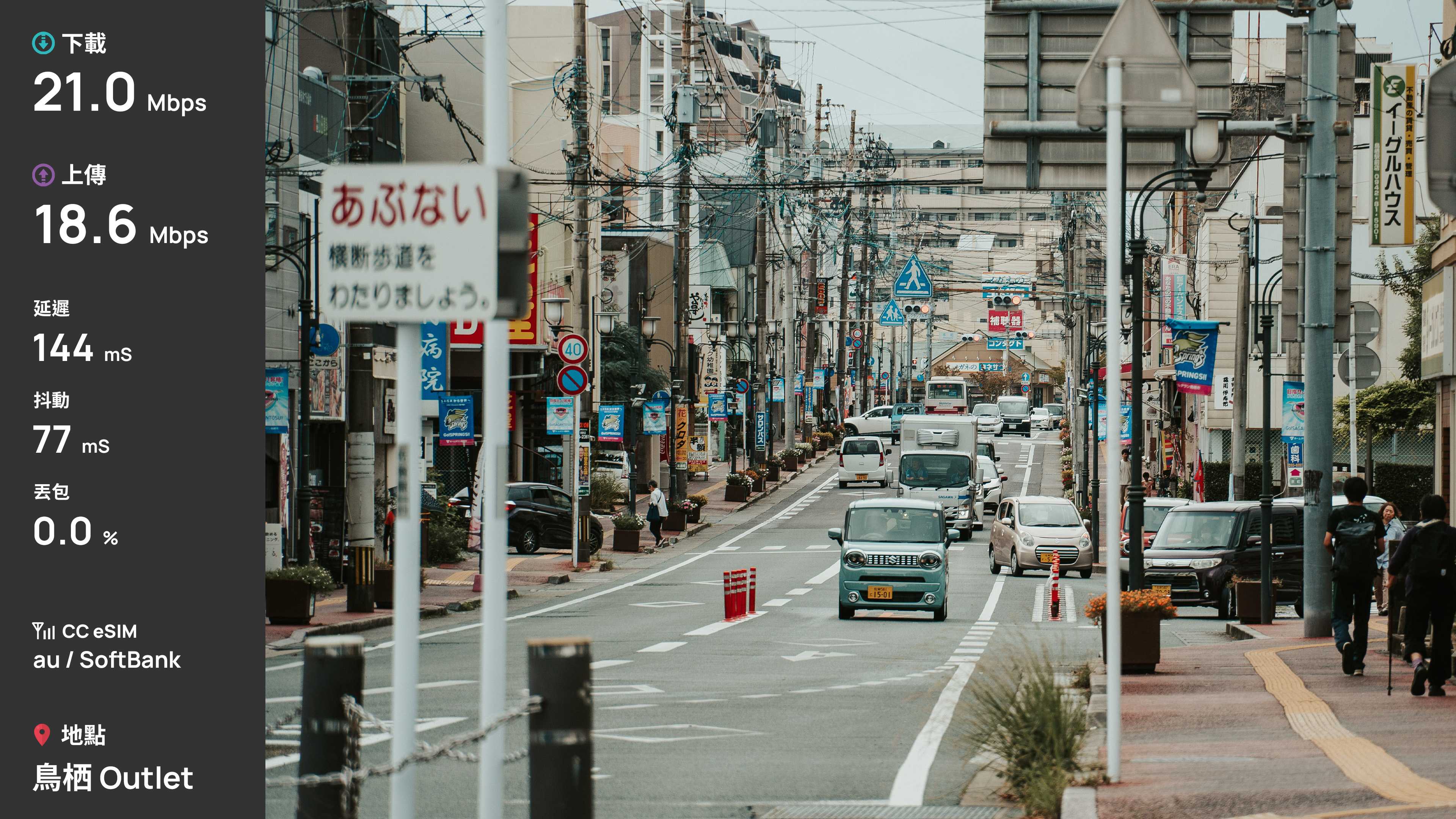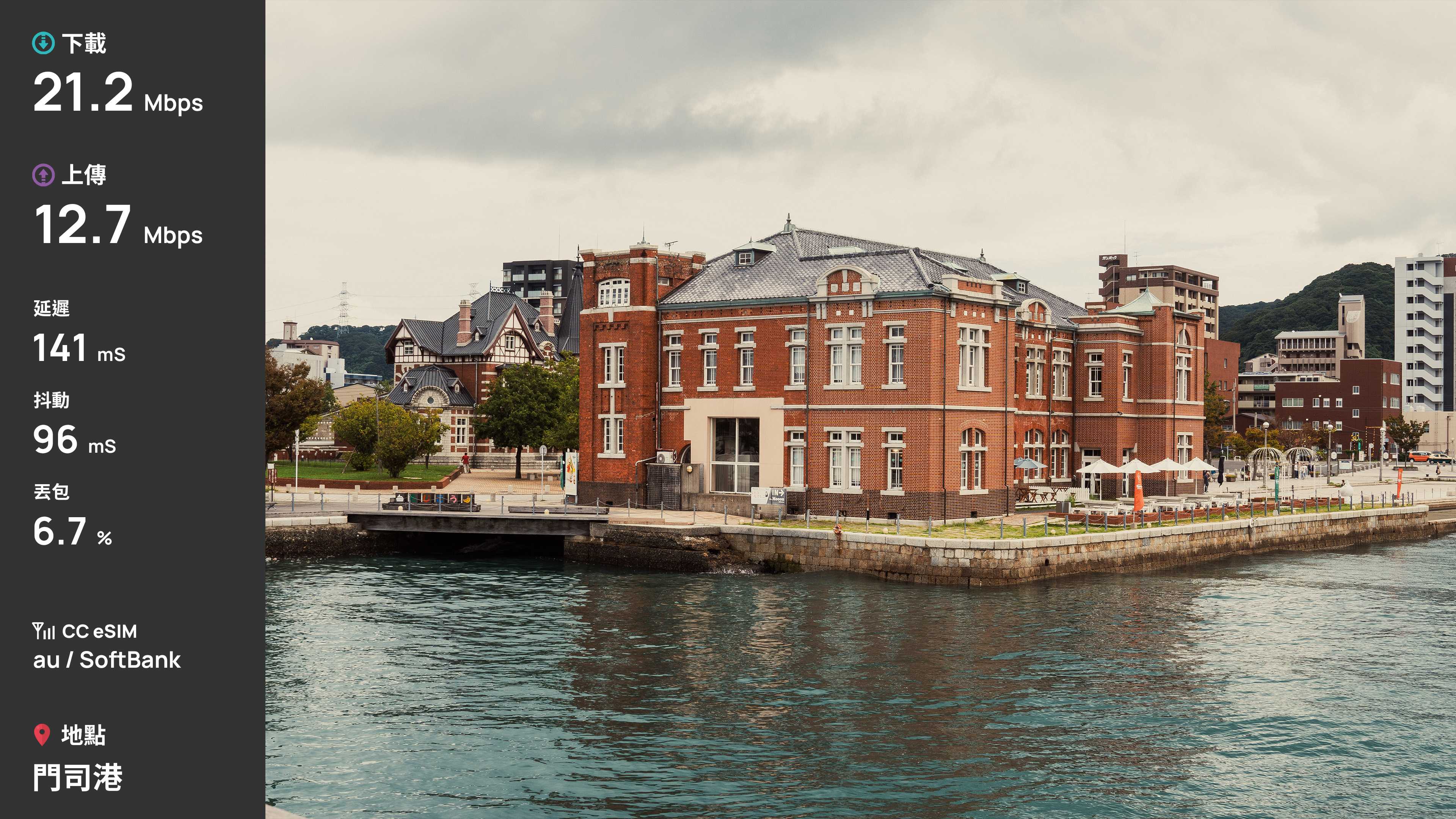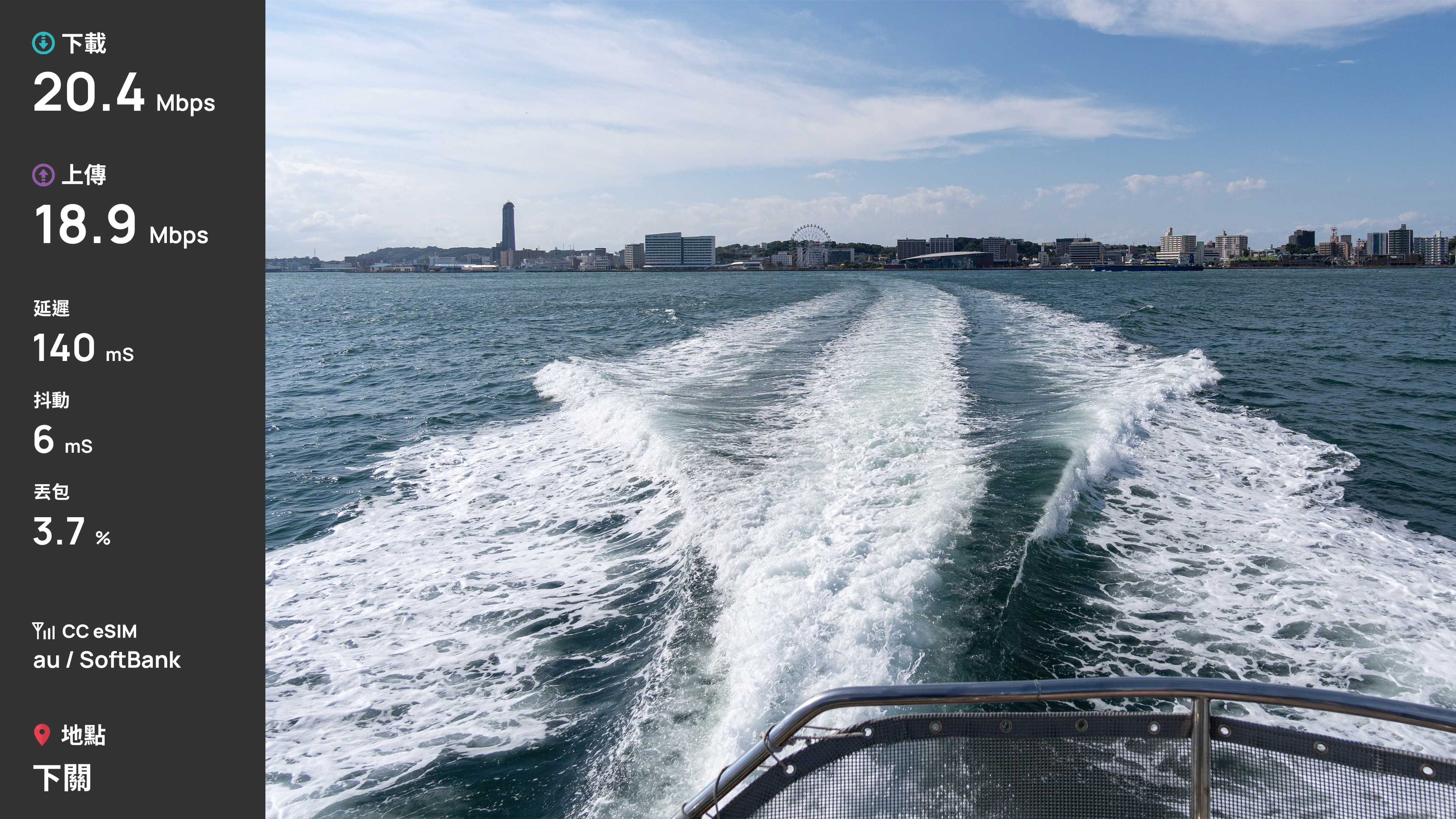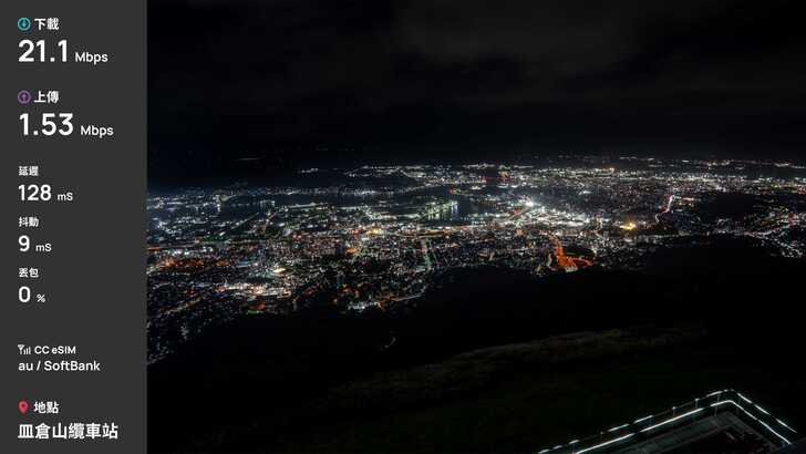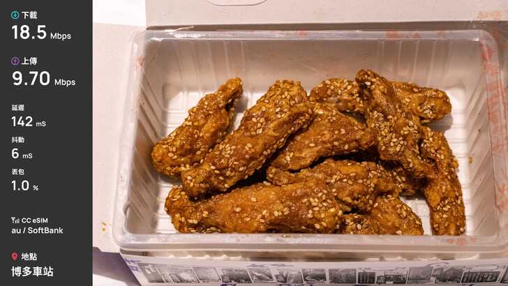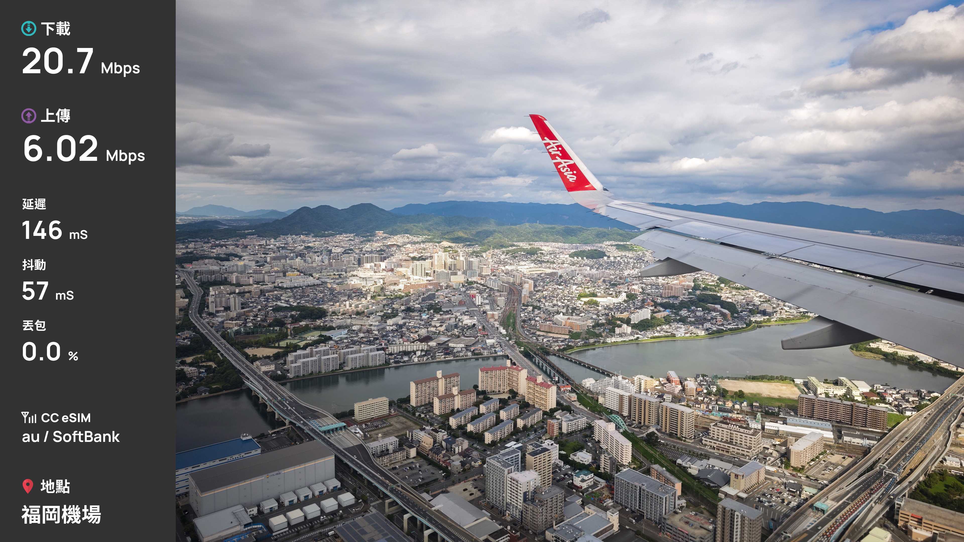 首先第一站,福岡國際機場,福岡機場是少數直接建在城市中心的機場,因此福岡市區多數建物不高。測速是在準備入境時測速,下載 20.7Mbps、上傳 6Mbps,表現合格。由於是漫遊方案,延遲來到了 146ms。