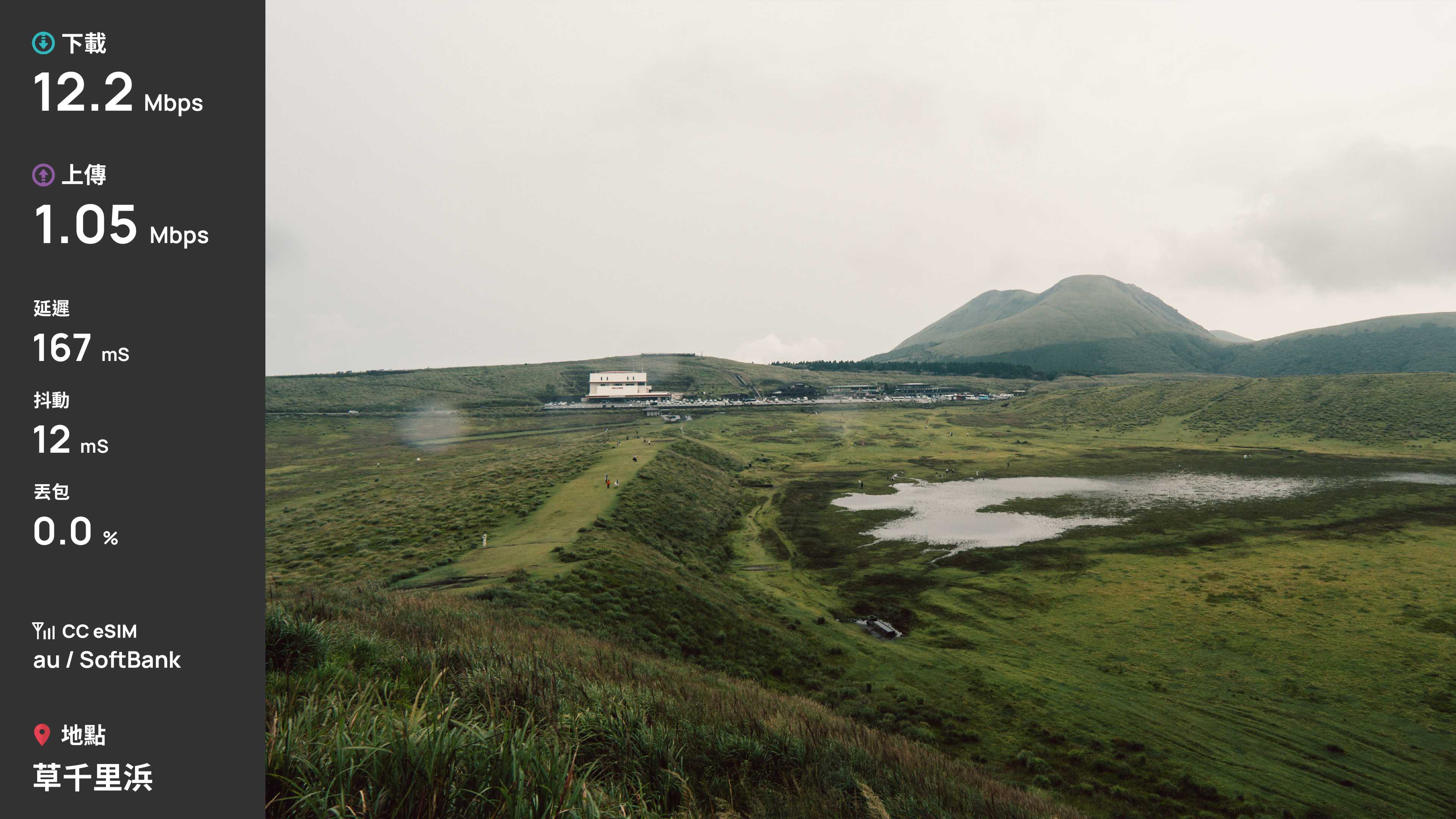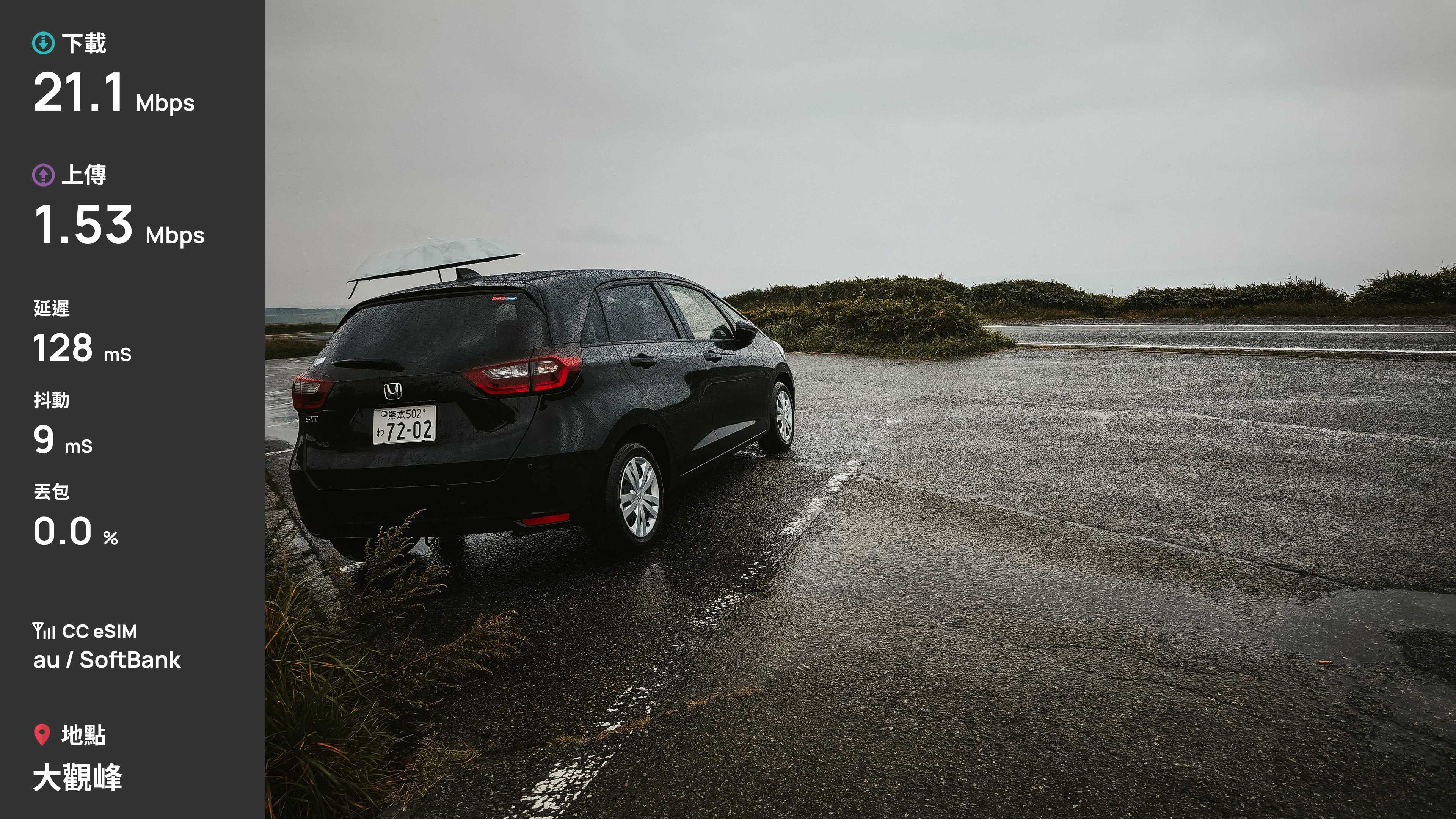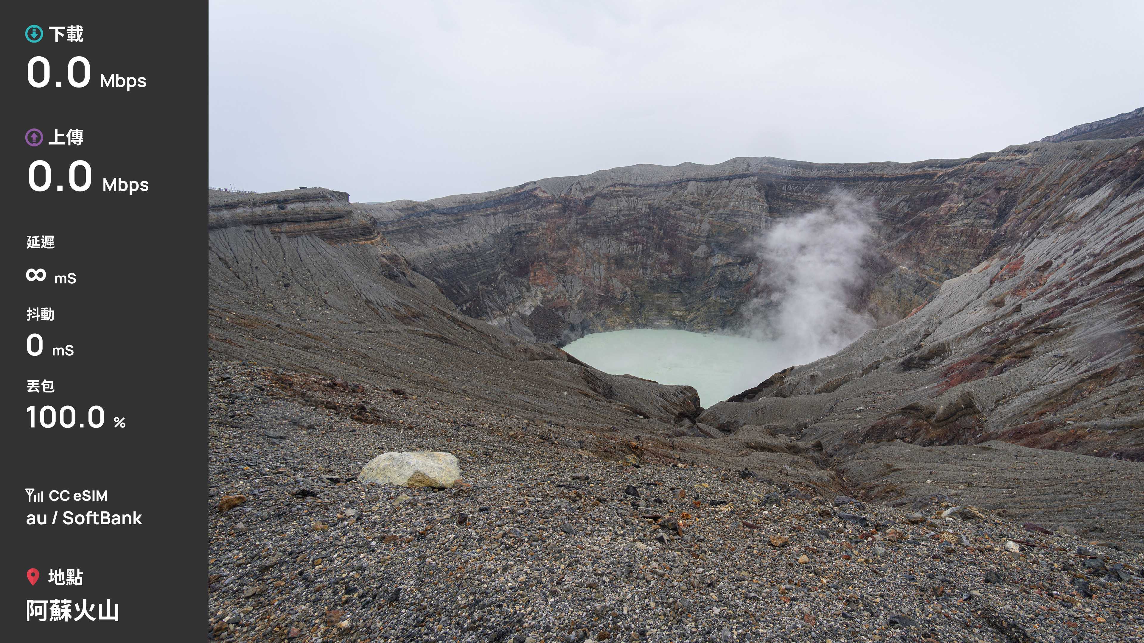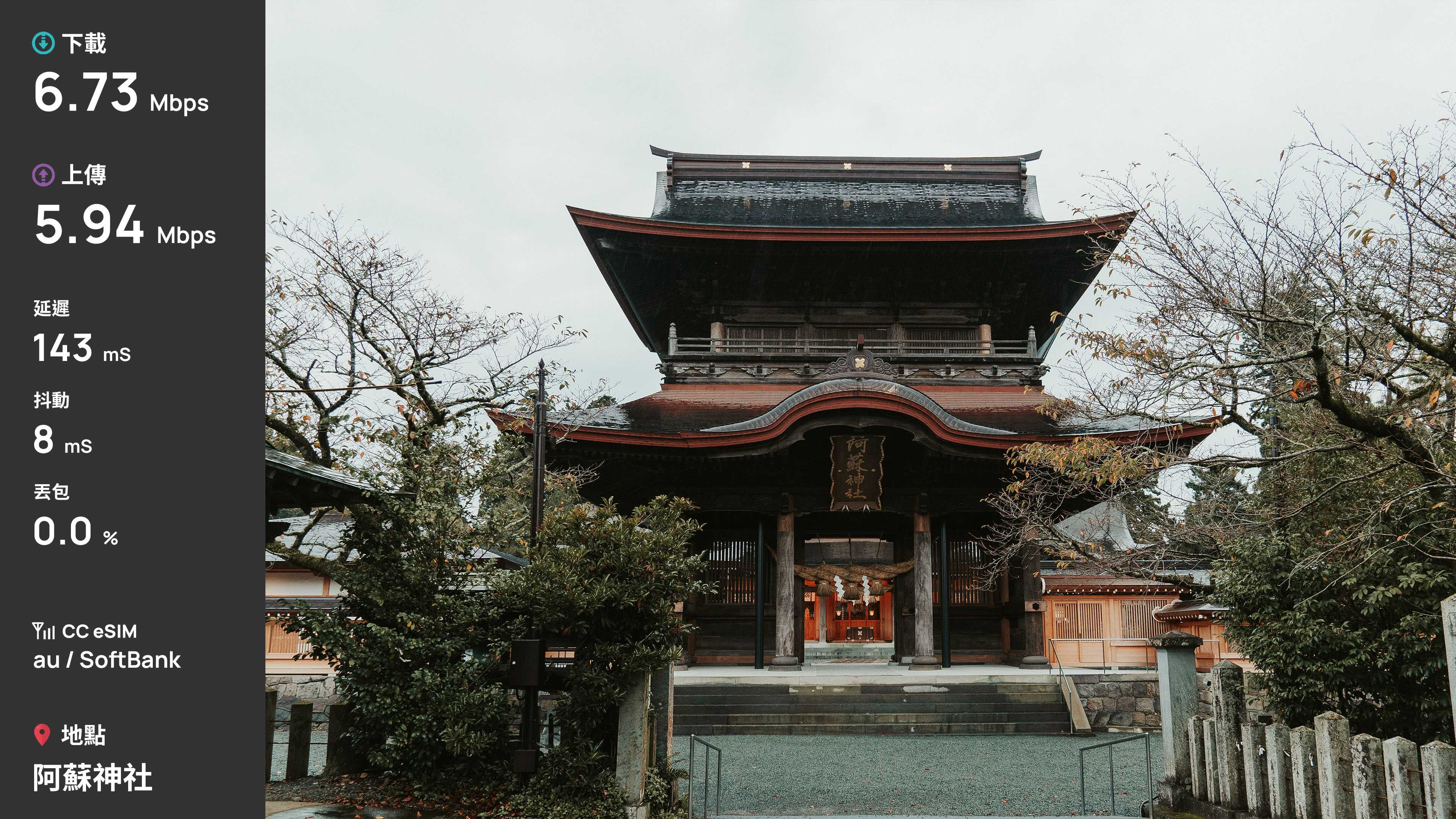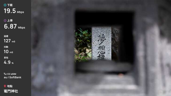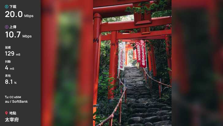 這次選擇了 CC 這家的 eSIM 做為 8 天九州自由行的網卡,速度上堪稱穩定,雖然能看出下載速度似乎被限制在 20Mbps 左右,不過其實對於我這種非重度用戶,也是很夠用了。20Mbps 對於旅遊中查資料和瀏覽網頁很足夠,我旅途中常用 Gemini Live 去問 AI 景點問題都能夠即時回應,且勝在不會頻繁掉速,這點體驗很好。雖然阿蘇火山口和秋芳洞沒有訊號,但後續查了一下,似乎是那區的通病,畢竟朋友的中華 Docomo 也是陣亡。只是這也會讓我疑惑,為何這個方案會是 au + SoftBank,畢竟通常 au 沒訊號,SoftBank 也會一起沒訊號,且整趟旅遊中手機也都是常駐 au。