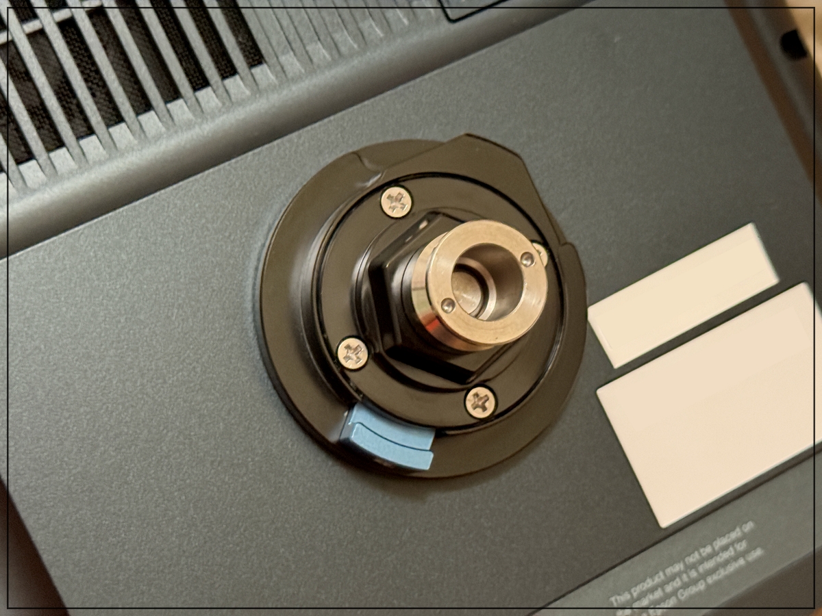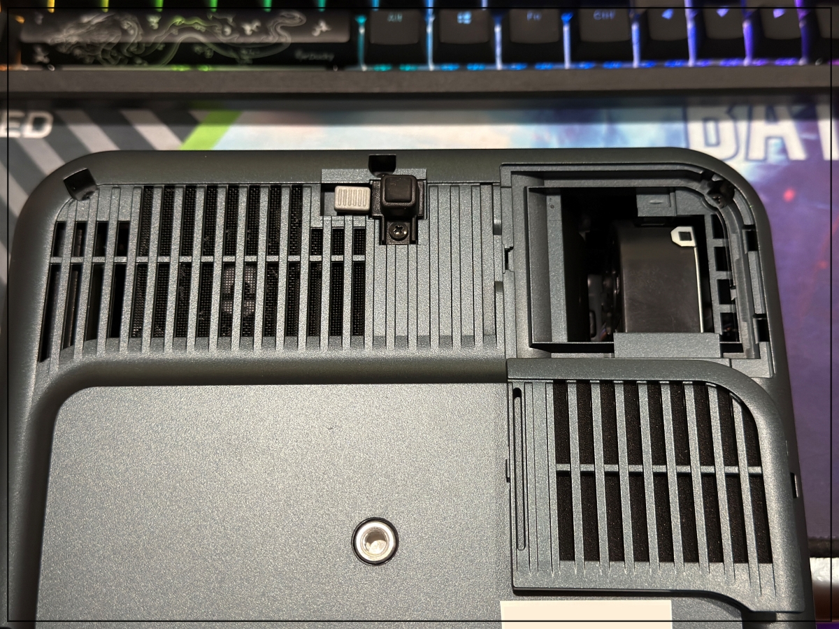 底部是風扇及散熱孔,右上角的蓋子可以拆卸,裡面有濾網可以清洗。機器中間的孔位符合標準攝影雲台,一般的腳架都可以使用。