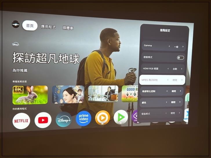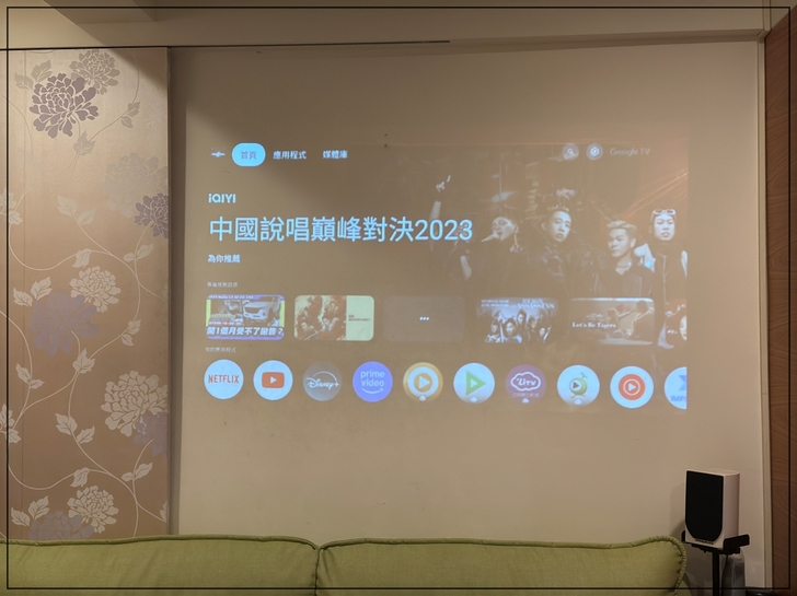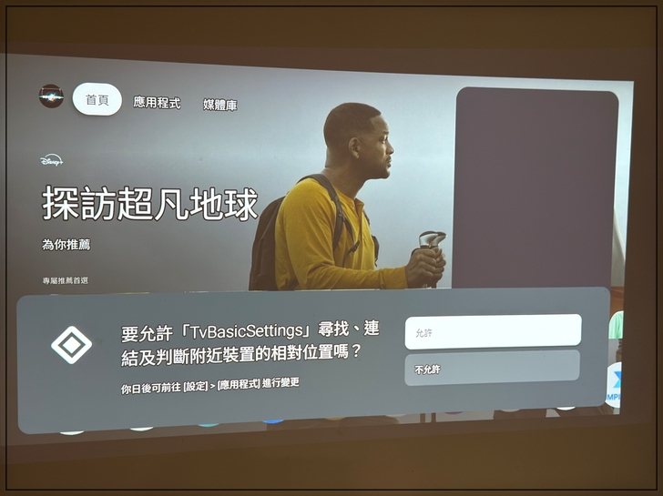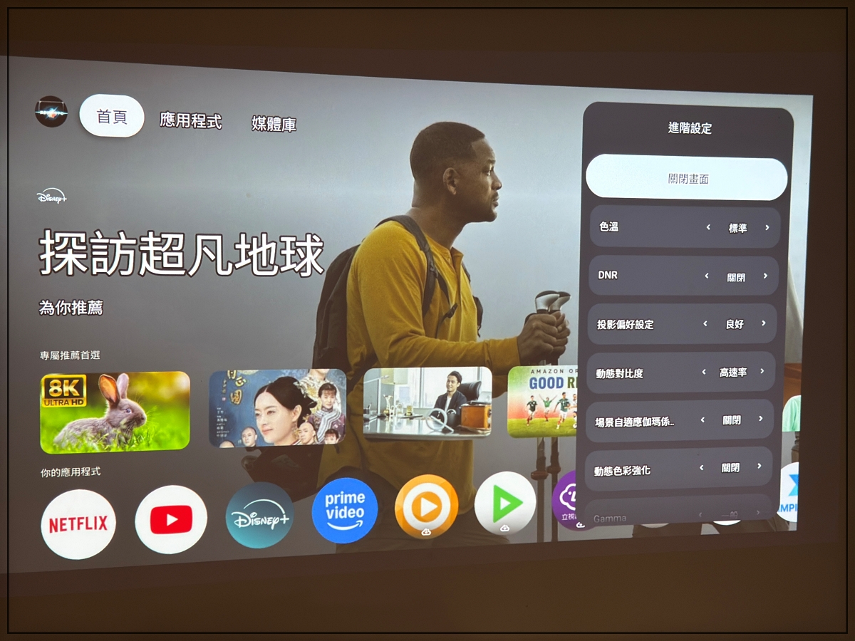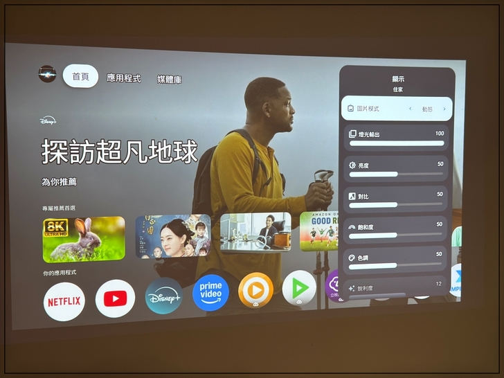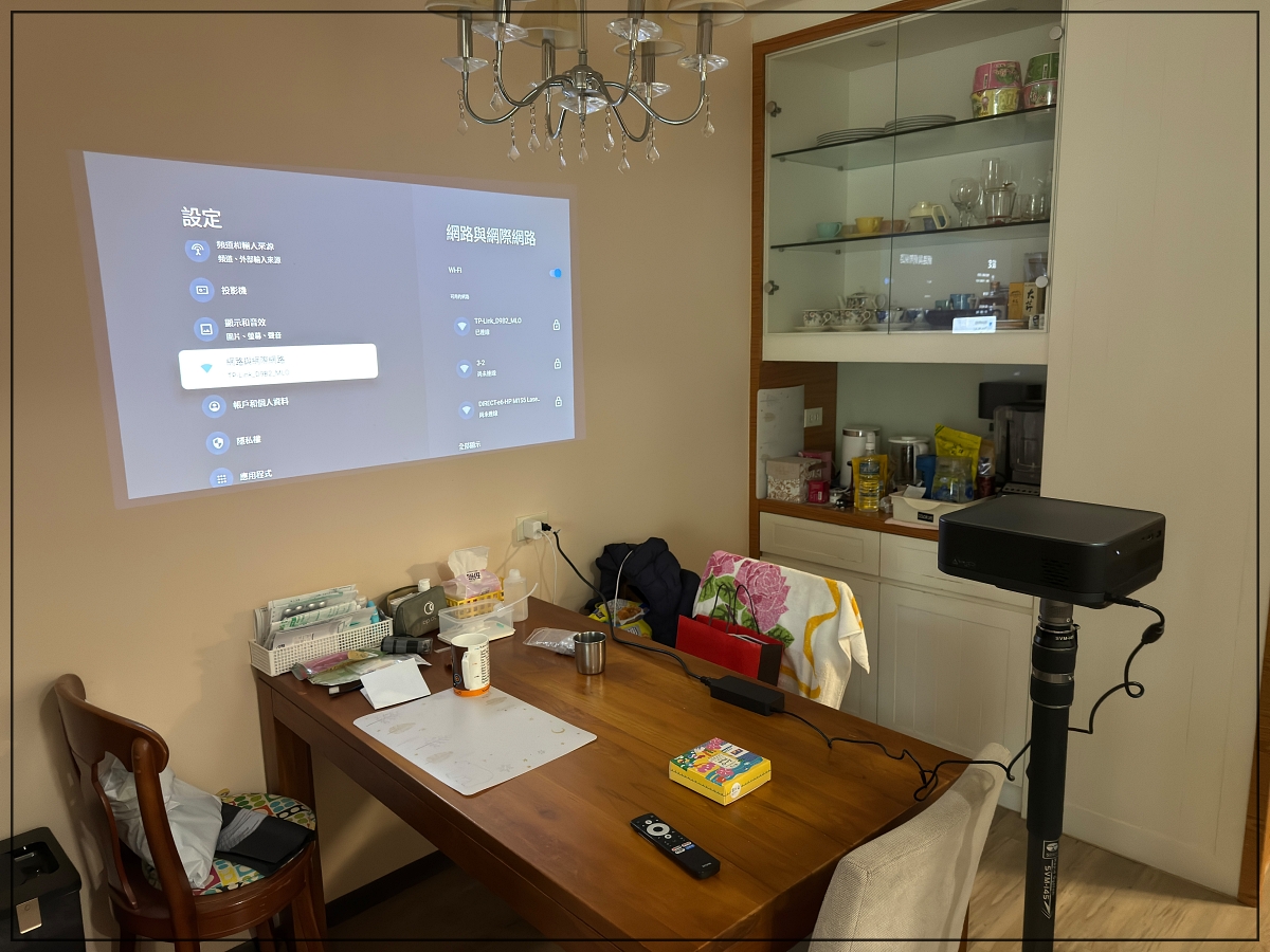 先來看一下我家客廳的投影狀況,目前我沒有布幕,所以是直接反過來投在牆壁上,投影機會自動設定投影畫面大小、方向、梯形校正等,完全都是自動的,這部分等等會著重介紹。