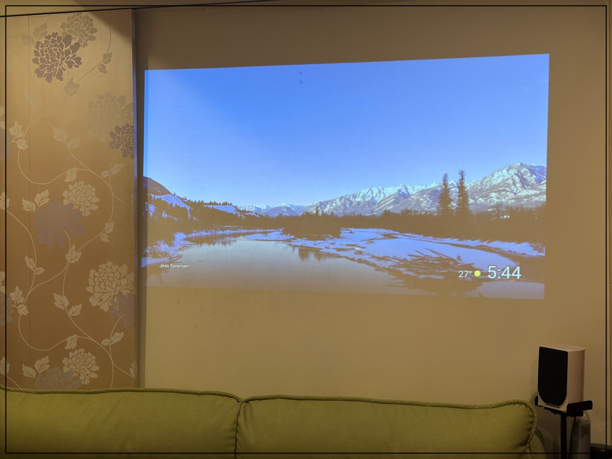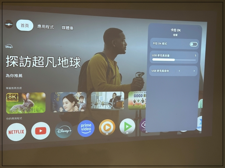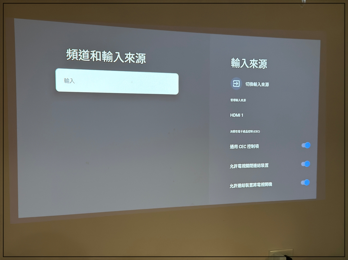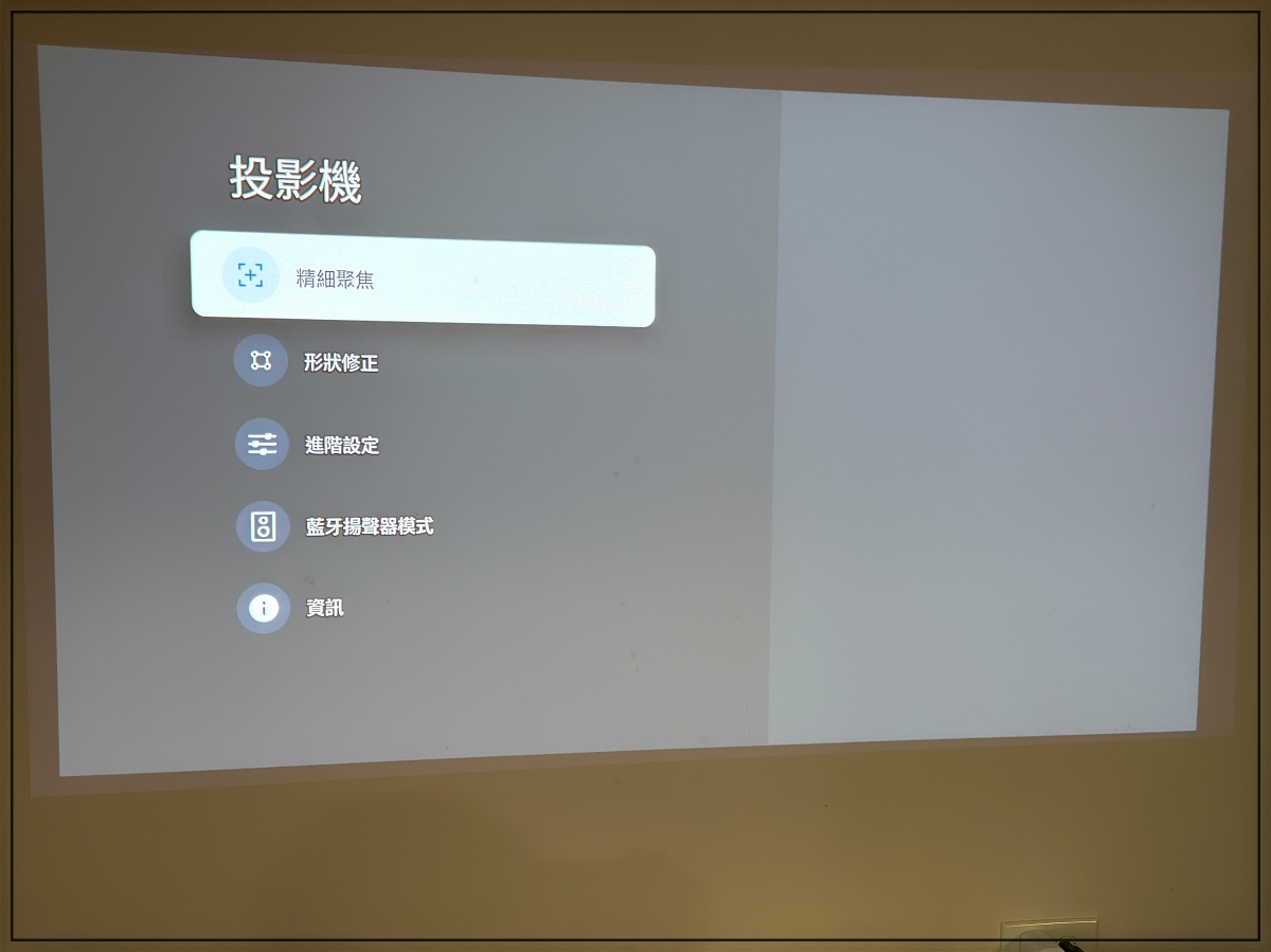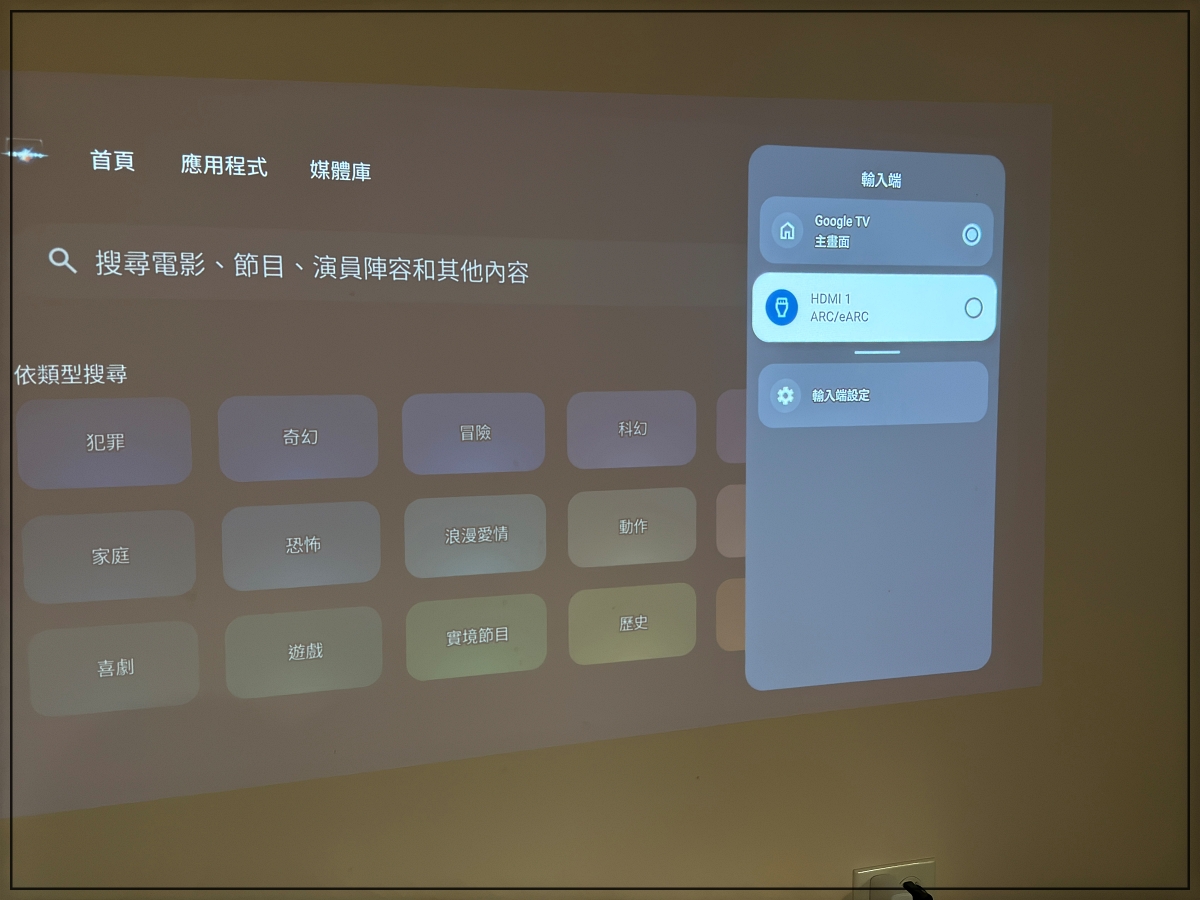 先來看一下我家客廳的投影狀況,目前我沒有布幕,所以是直接反過來投在牆壁上,投影機會自動設定投影畫面大小、方向、梯形校正等,完全都是自動的,這部分等等會著重介紹。